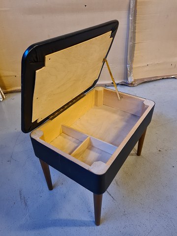 Puf i kunstlæder med ben af bøgetræ, fra 1960erne.