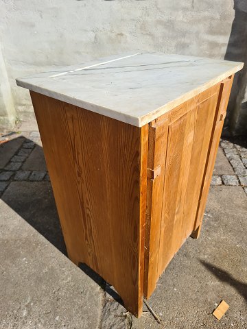 Servante fra 1920´erne i fyr og med mamor. Fremstår pæn, velholdt og funktionsdygtig. Dog med to huller øverst lige under mamorpladen i venstre side. (billede)