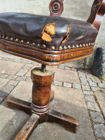 Gammel kontorstol fra 1930'erne I eg, på drejefod og med lædersæde. Fremstår pæn og stabil dog med læderskader på hjørnerne af sædet. (billede)