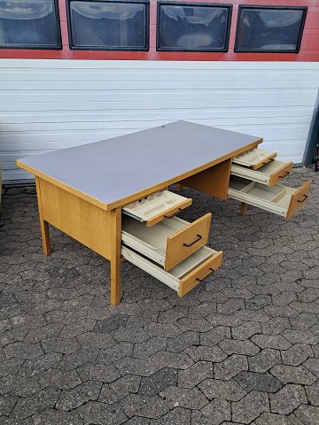 Skrivebord i egetræ med linoleumsplade, fra 1980erne.