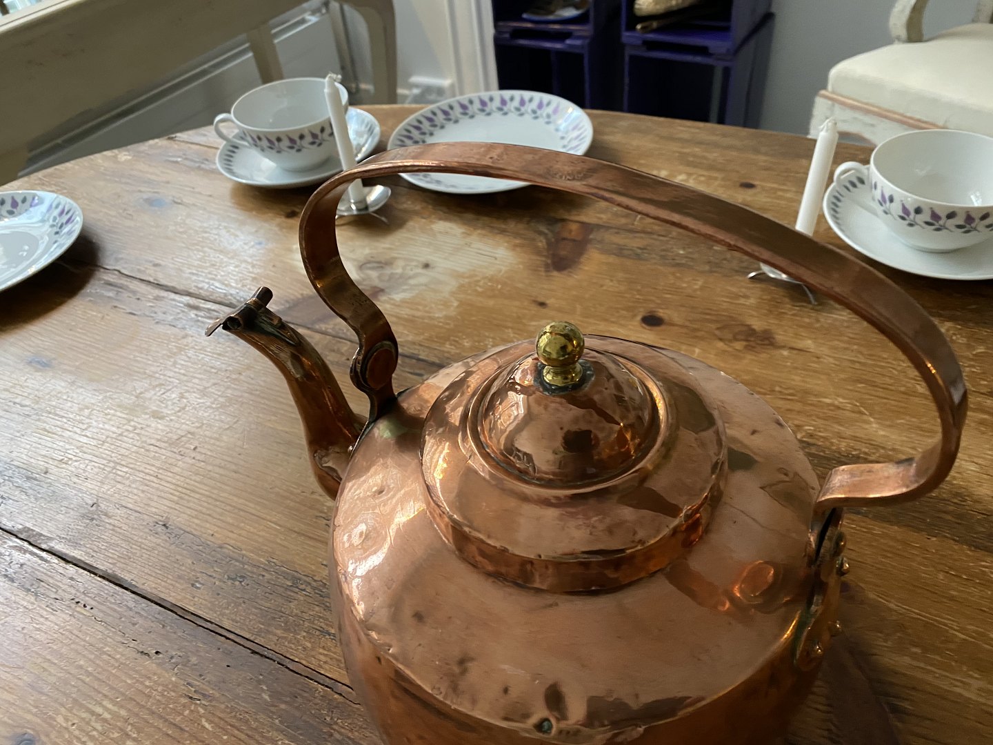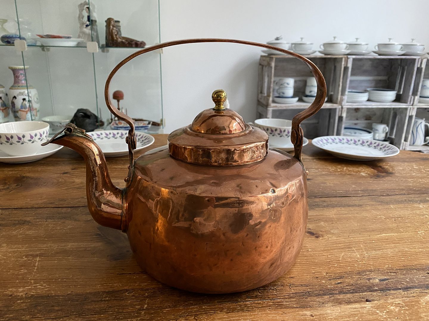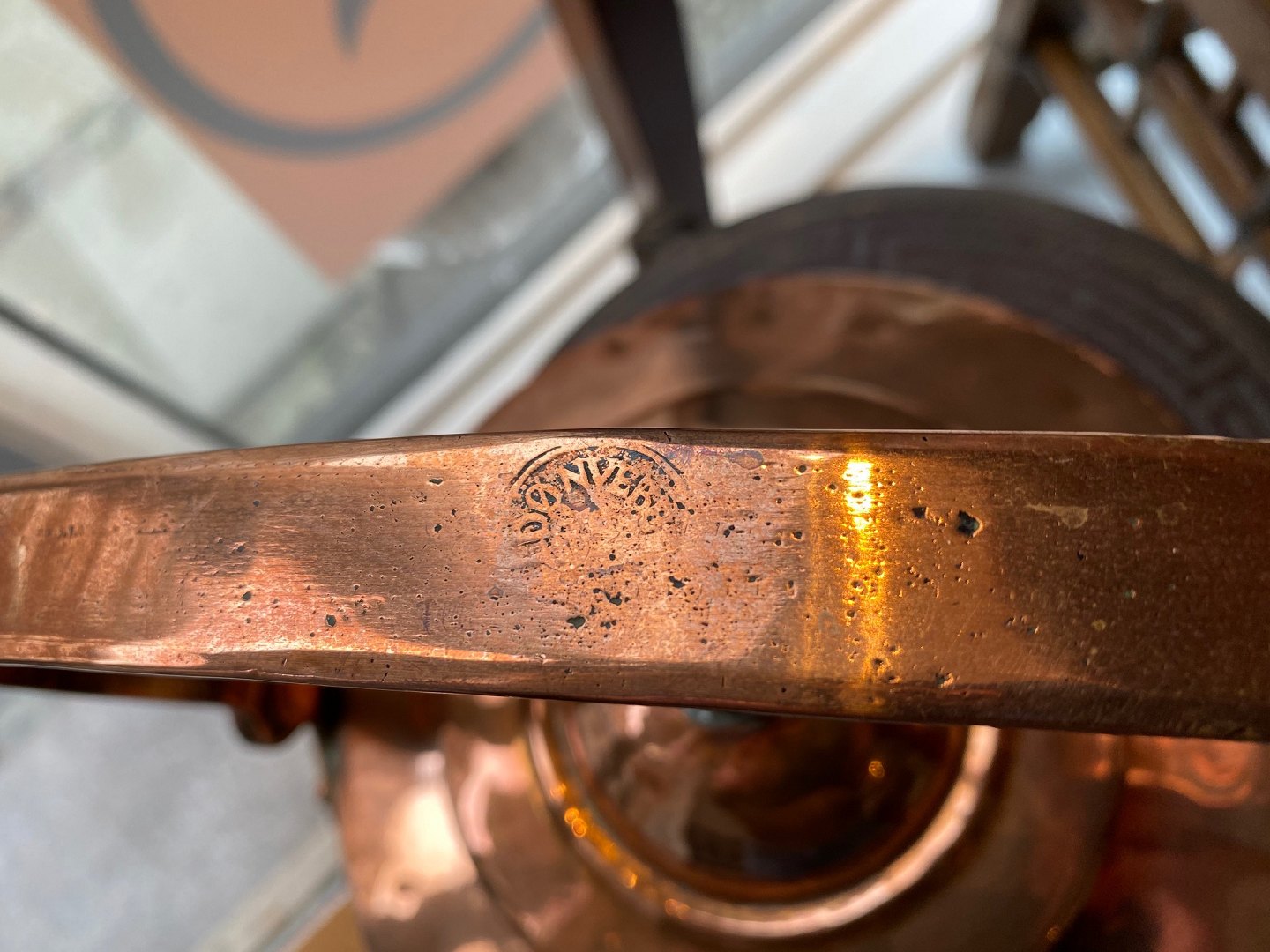 Dansk kobberkedel med udtydeligt stempel, 19. århundrede, højde ca. 23 centimeter inklusive hanken. Fin stand. Under bunden er indridset en dato med lille skrift. På et håndskrevet klistermærke står der, at familien har solgt en kongelig figur for i stedet at købe kedlen.