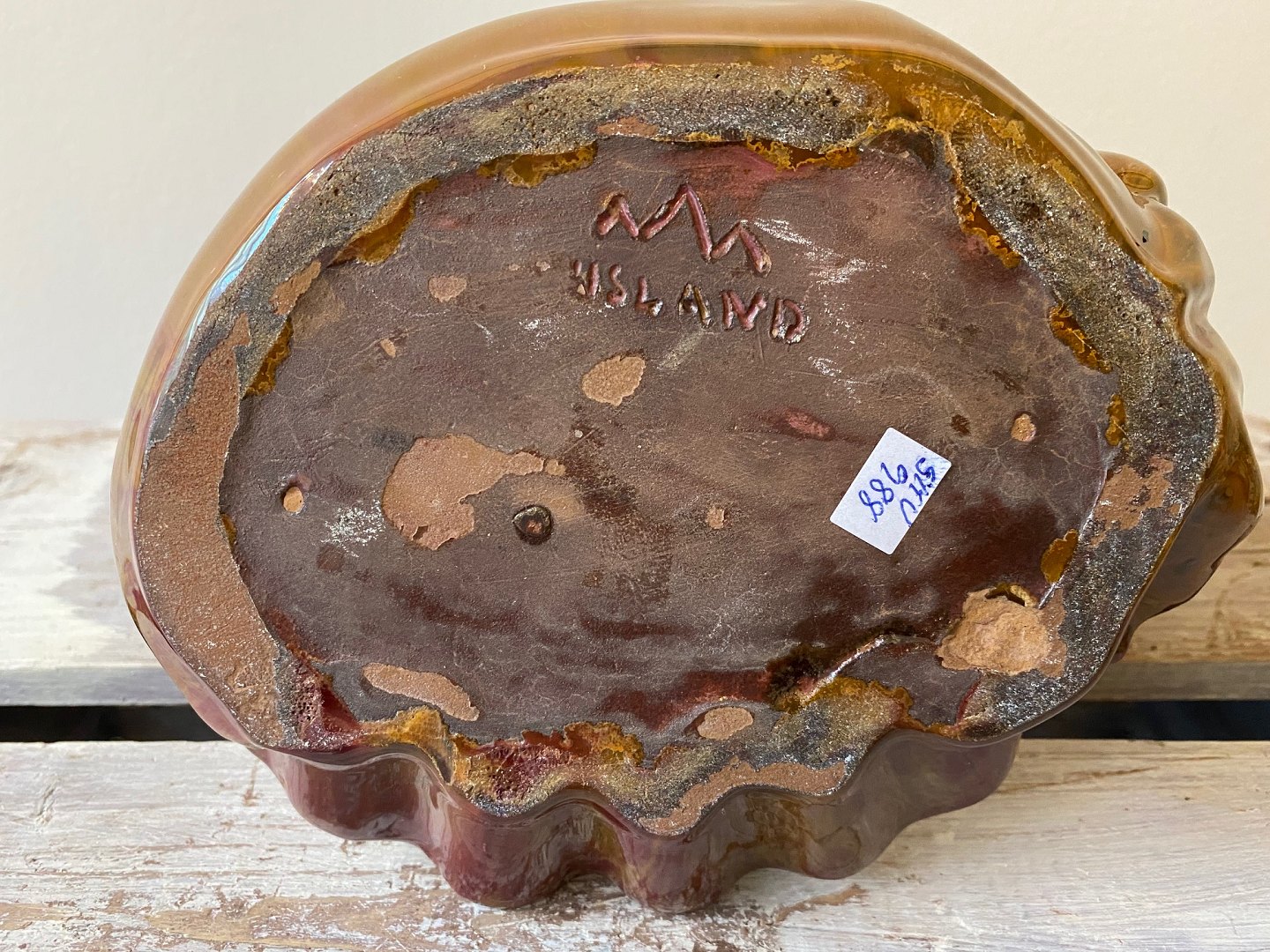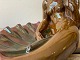 Smuk figur af havfrue / skål. Figuren er skabt af den islandske kunstner Gudmundur Einarsson (Guðmundur frá Miðdal) og signeret med hans signatur med tretoppede bjerge samt "Island". 1930erne / 1940erne. Glasur i smukke jordfarver og røde toner.