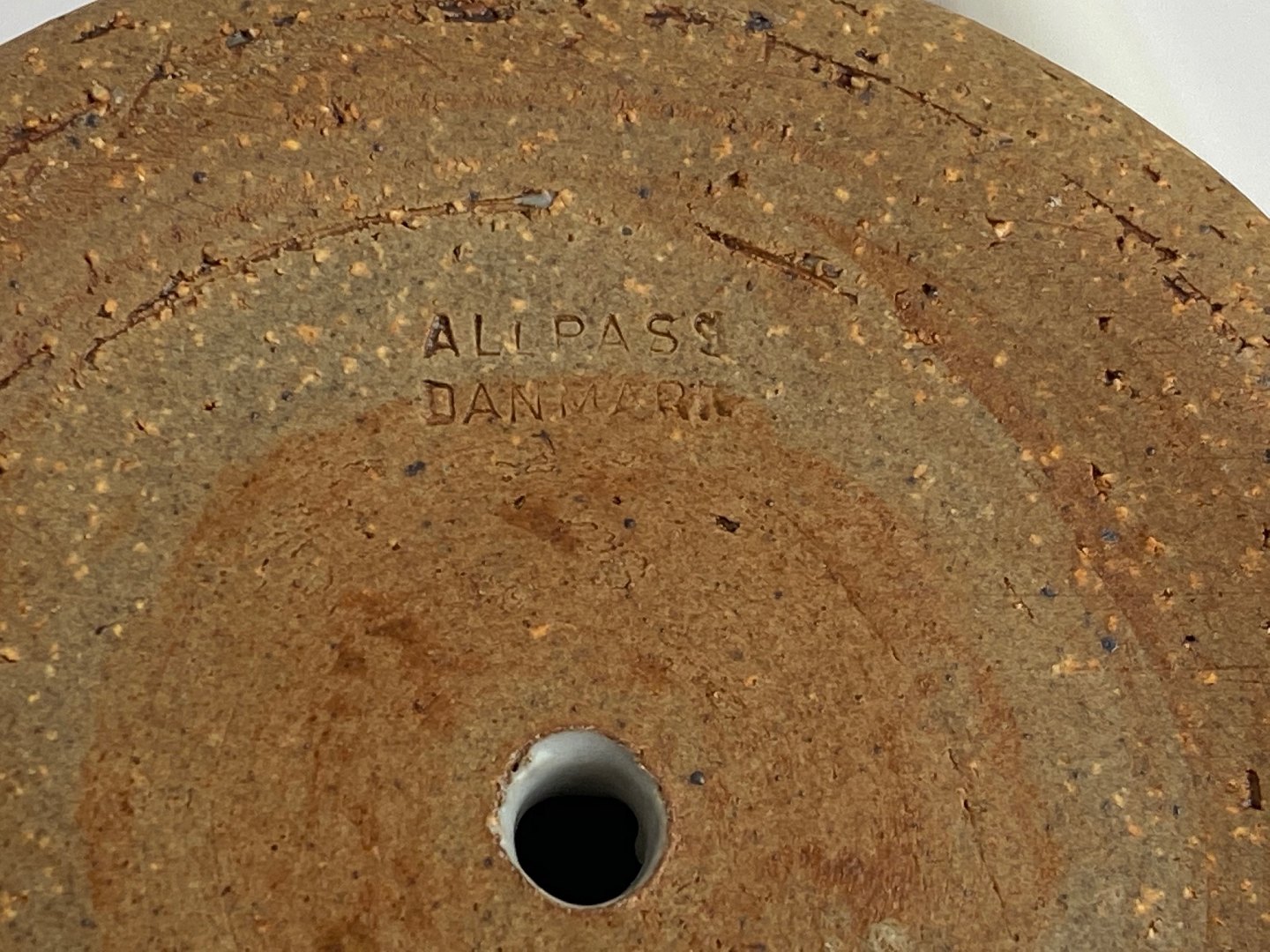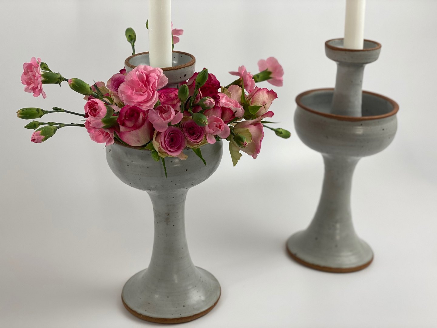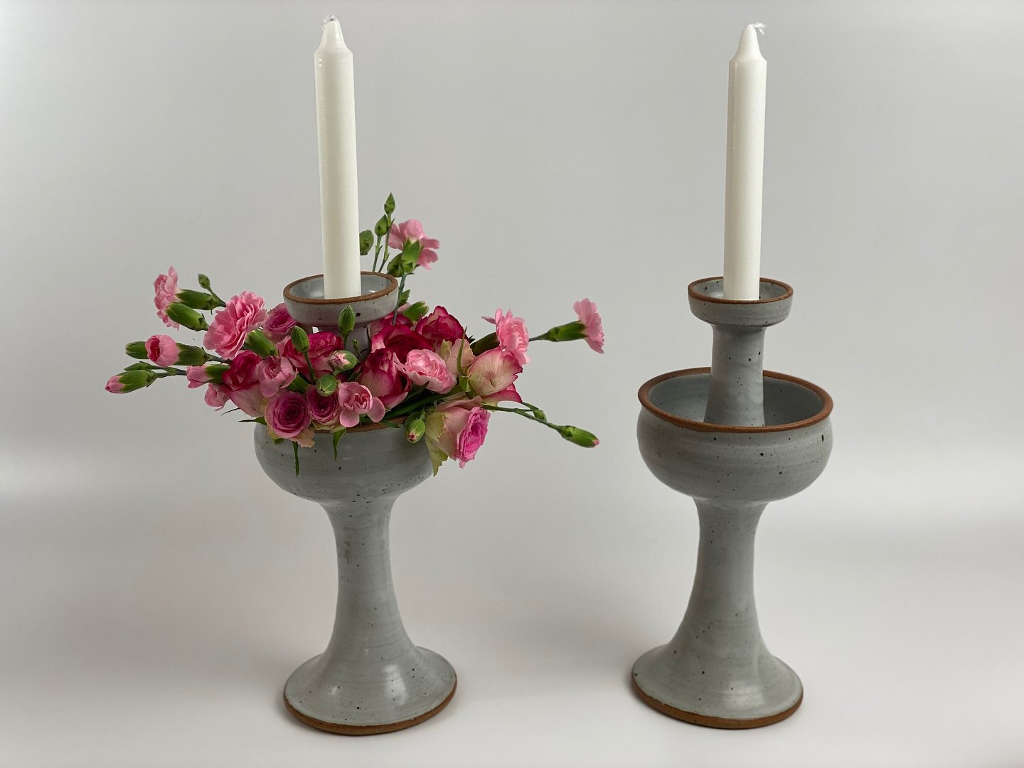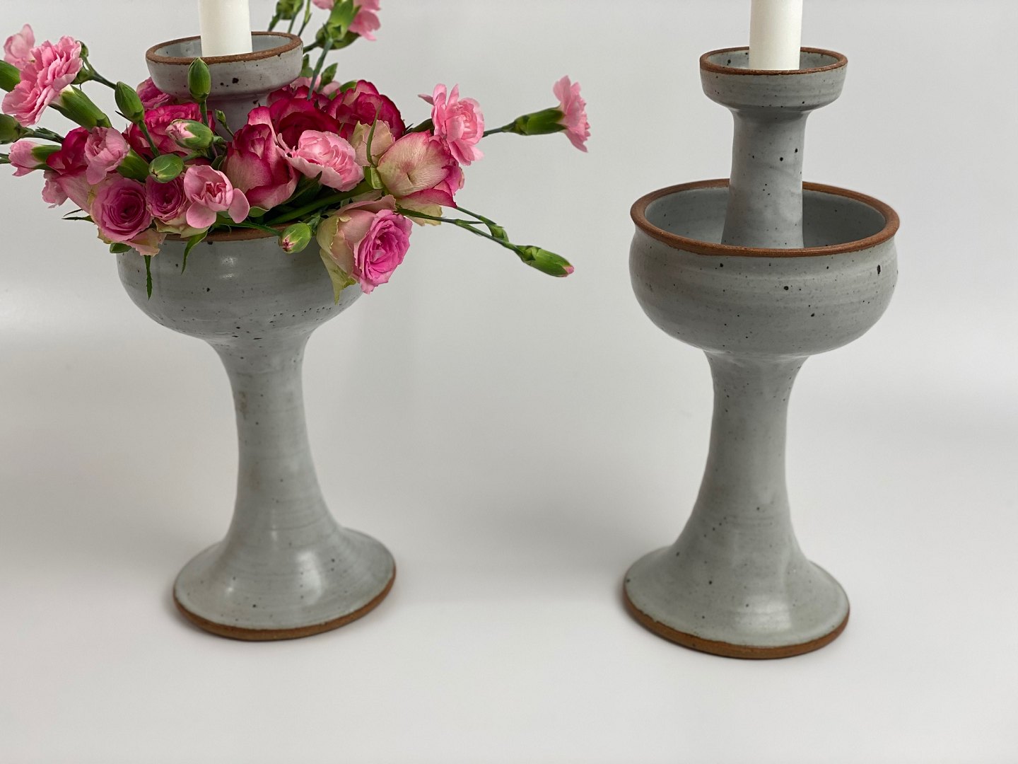 Et par store, flotte lysestager af den danske keramiker Helle Allpass (1932-2000) fra hendes eget værksted, cirka 1970'erne. Lysestagerne kan pyntes med blomster, der står i vand i en skål rundt om lysholderne. Rigtig fin stand med nogen skævhed, som stagerne er "født" med.