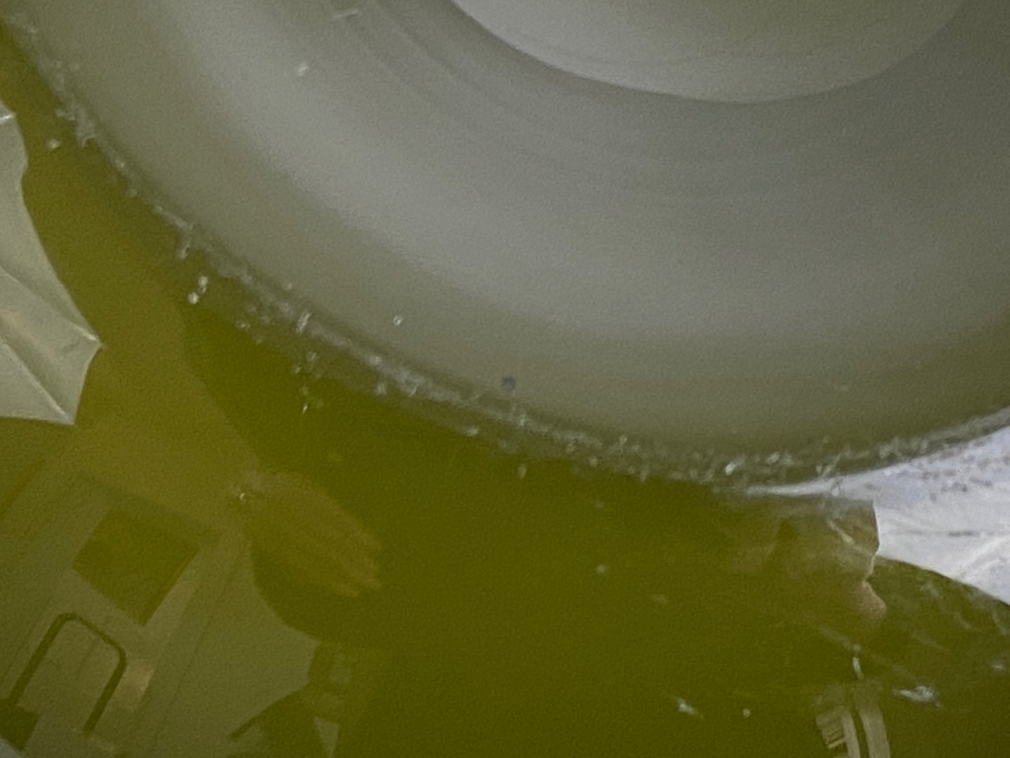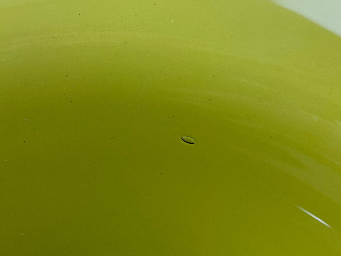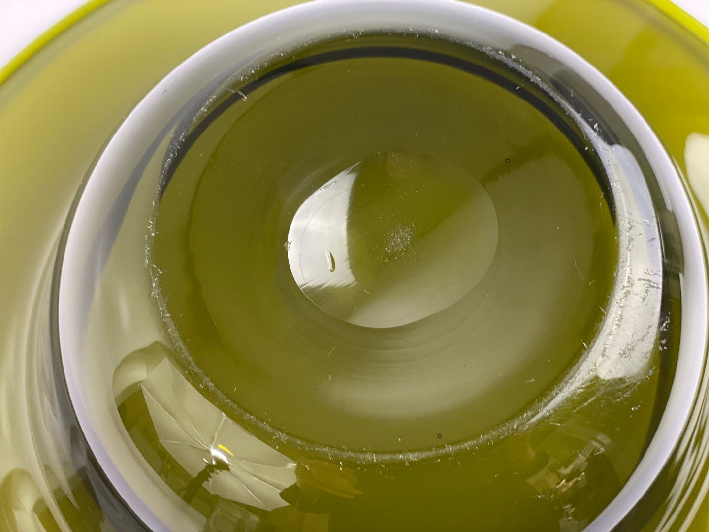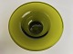 Gammel glasskål / glasfad af mosgrønt glas med form som en hat. Slitage.