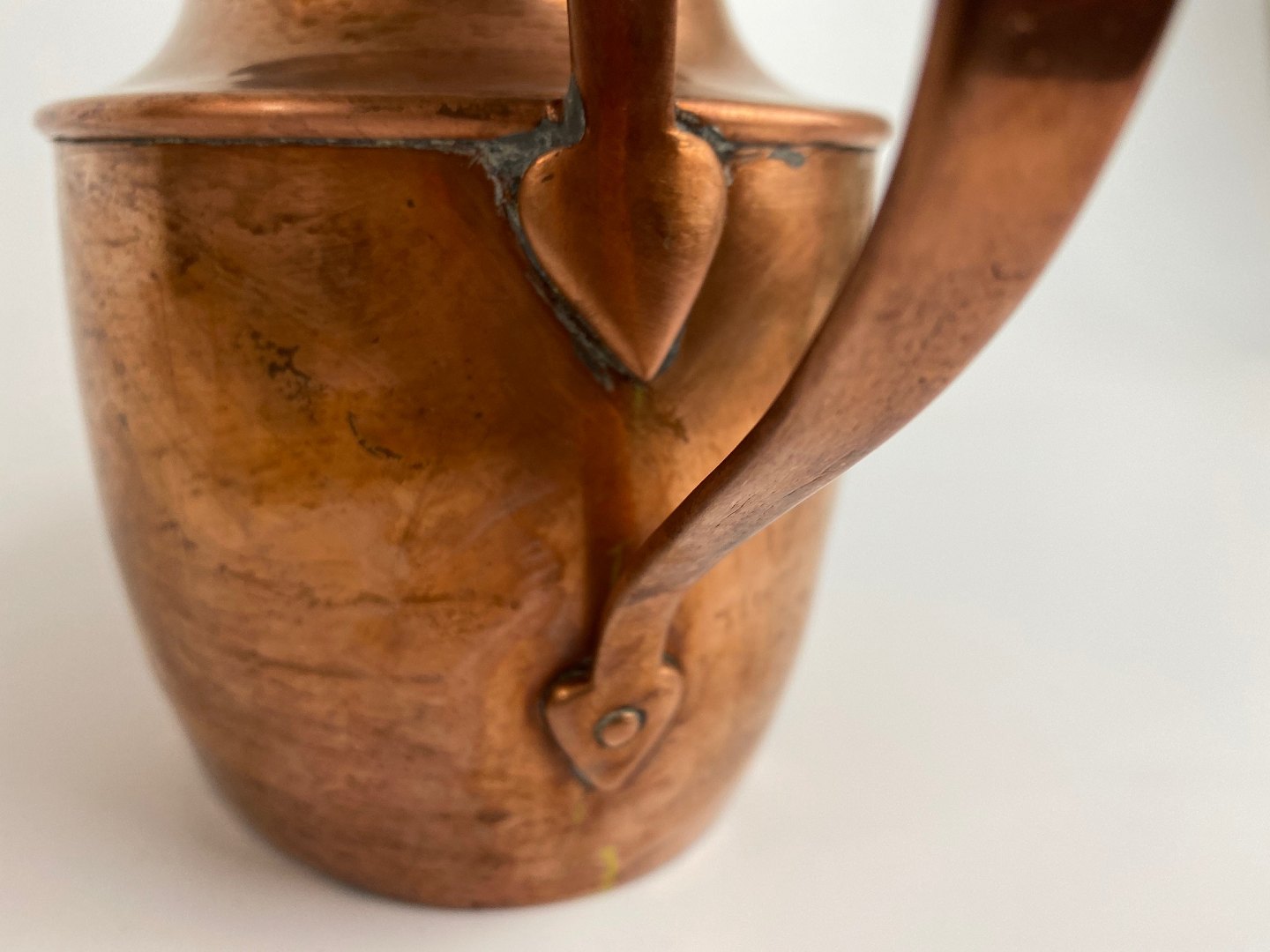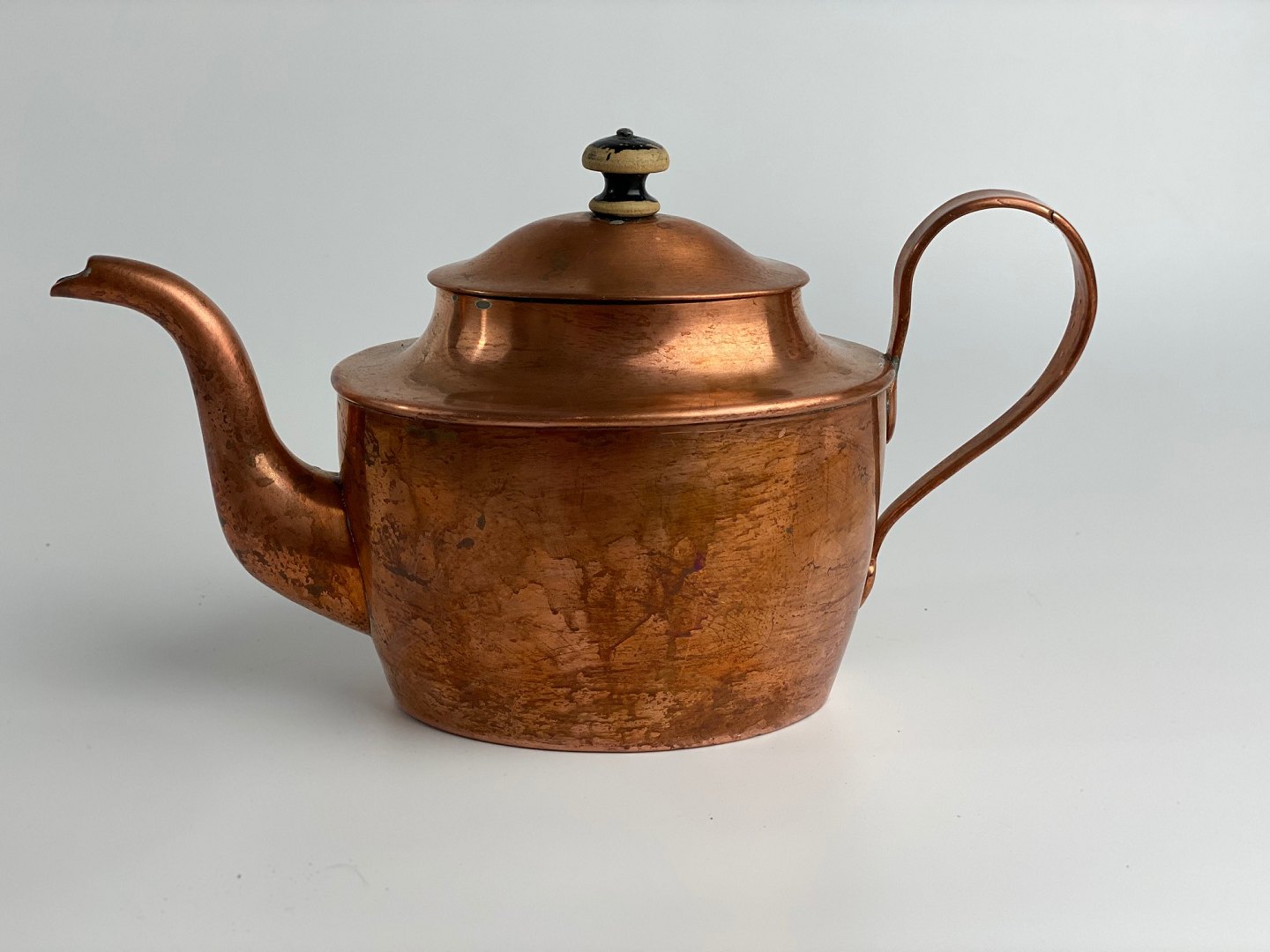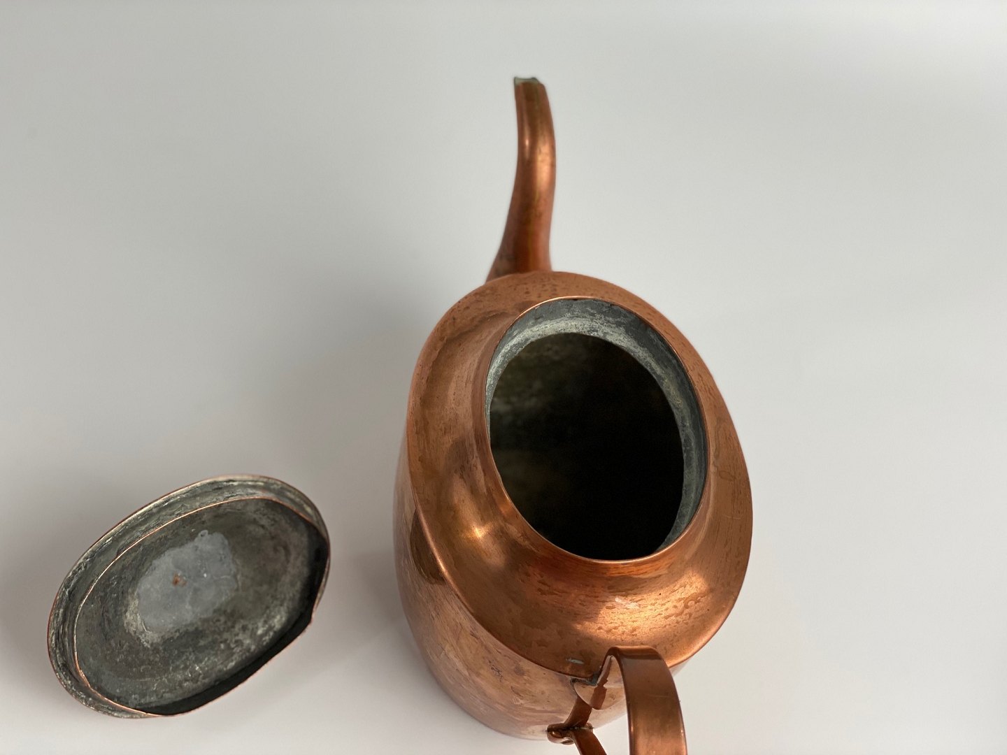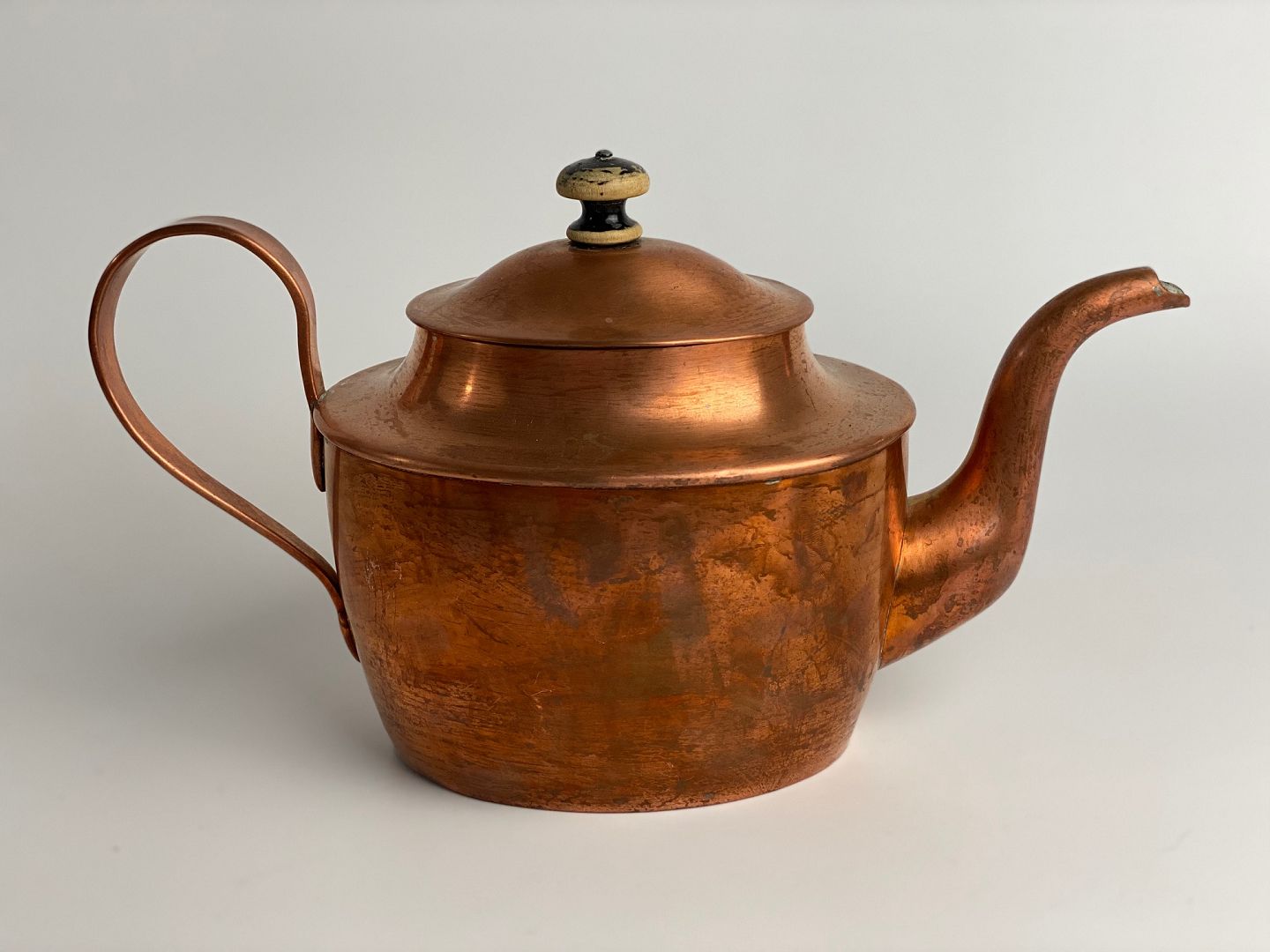 Dansk antik empire tekande, kobber og tin, fra det 19. århundrede. Tekanden er stemplet med dansk kobberstempel. Lågknop af træ. Fin antik stand. Bemærk hak på hank.