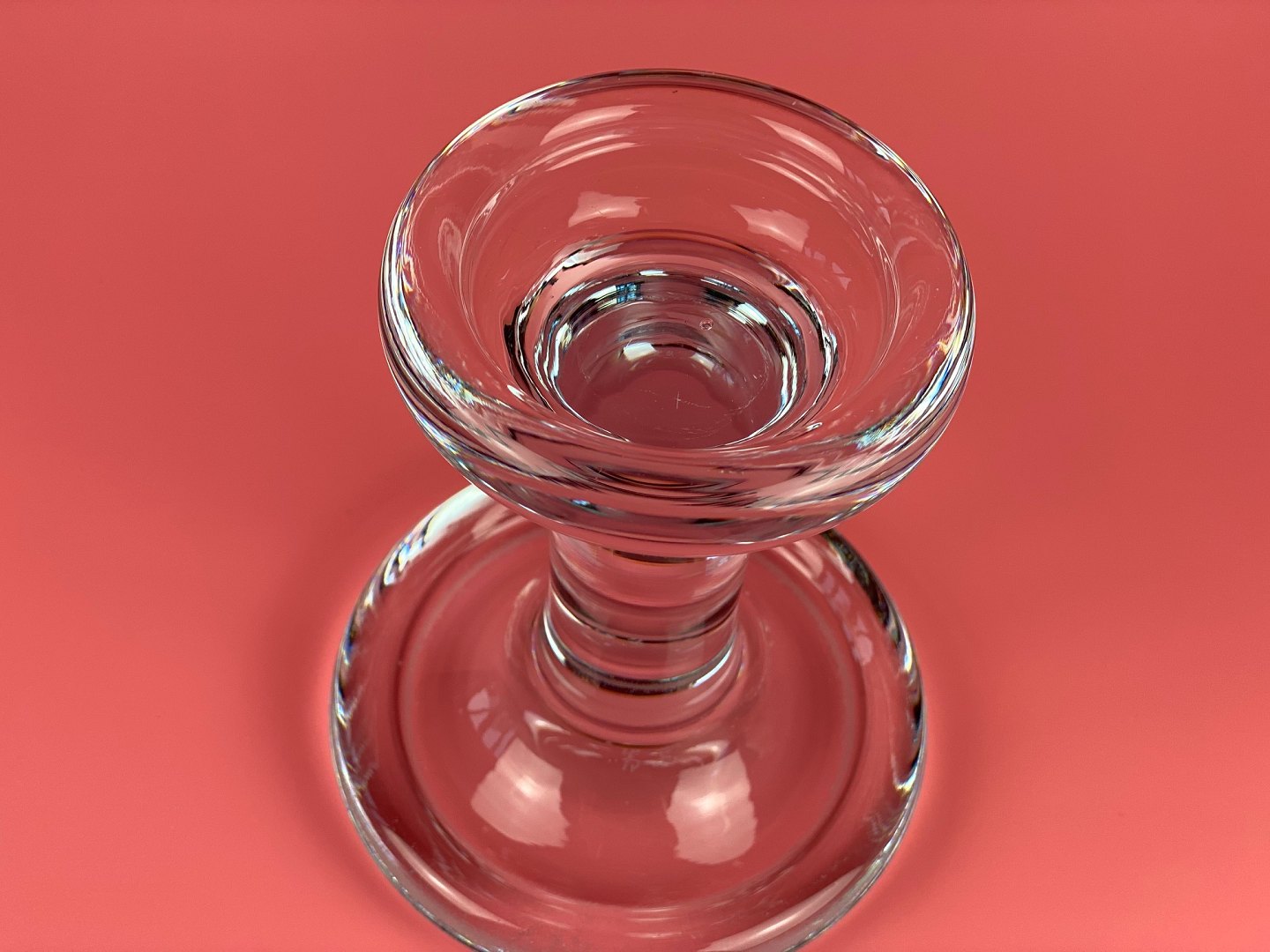 Lysestage af massivt, klart glas af Michael Bang for Holmegaard i 1978. Stagen hedder Adonis og måler 15,50 centimeter i højden og er 12,60 centimeter bred.