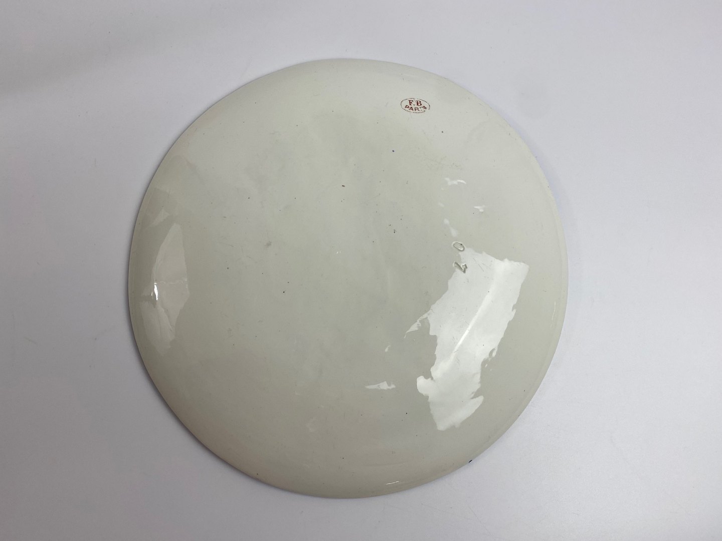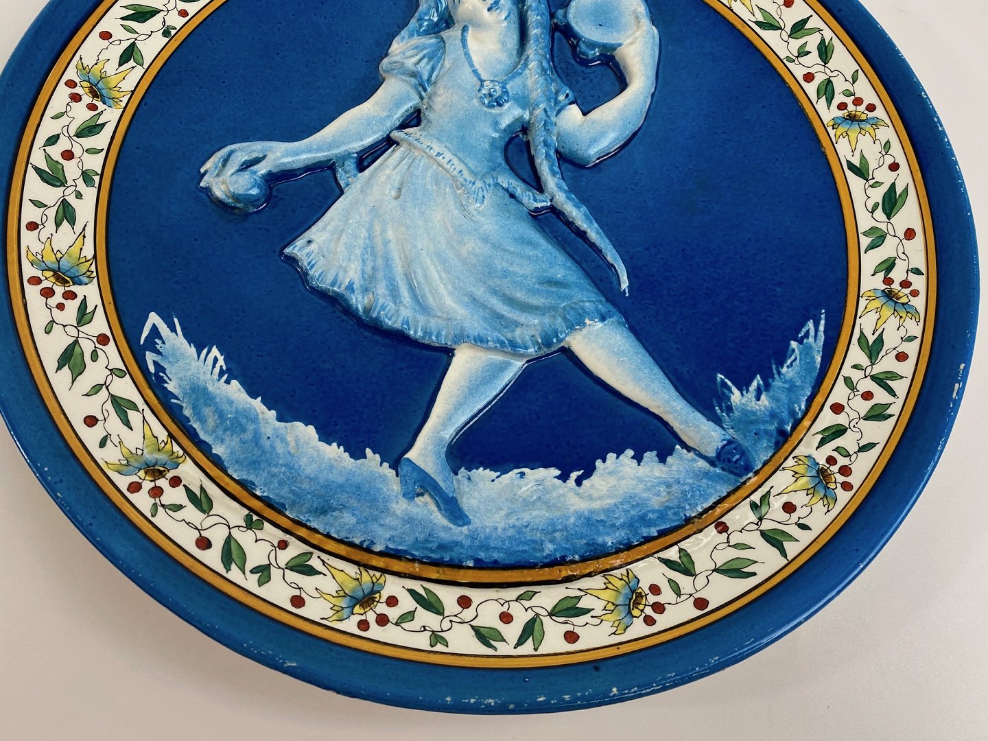 Fransk platte / fajancetallerken til ophæng på væg i relief med motiv af dansende og musicerende pige med kastagnetter og tamburin. Pigen har langt hår med fletninger og krans på hovedet og danser på en græsplæne eller skovbund. Tallerkenen er mærket F.B. Paris.