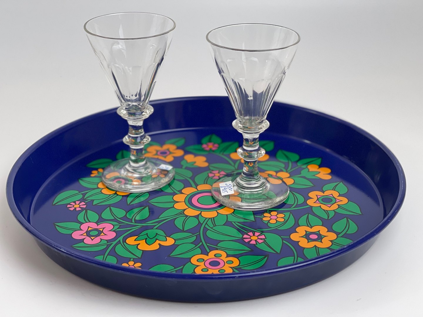 Smuk retrobakke fra Worcester af Pat Albeck. På bakken: To fine Anglais hvidvinsglas fra Holmegaard, som vi sælger for 150 kr. stykket.