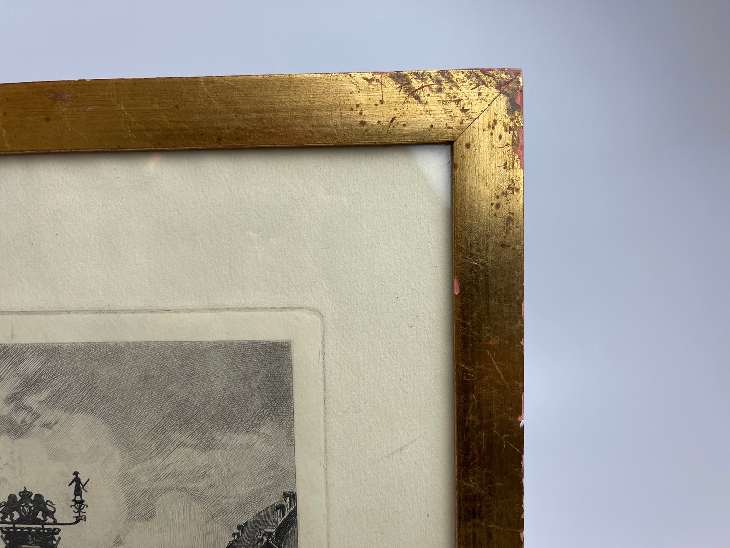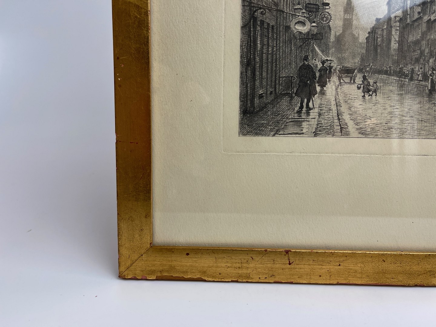 Smuk, gammel guldramme med patina med radering af Peter Tom-Petersen fra Adelgade i København: "Adelgade med tømrerskiltet". Raderingen er usigneret, og der er formentligt tale om et prøvetryk. Du kan se den signerede udgave her: https://petertom-petersen.dk/side-2.html (se under nr. 39).