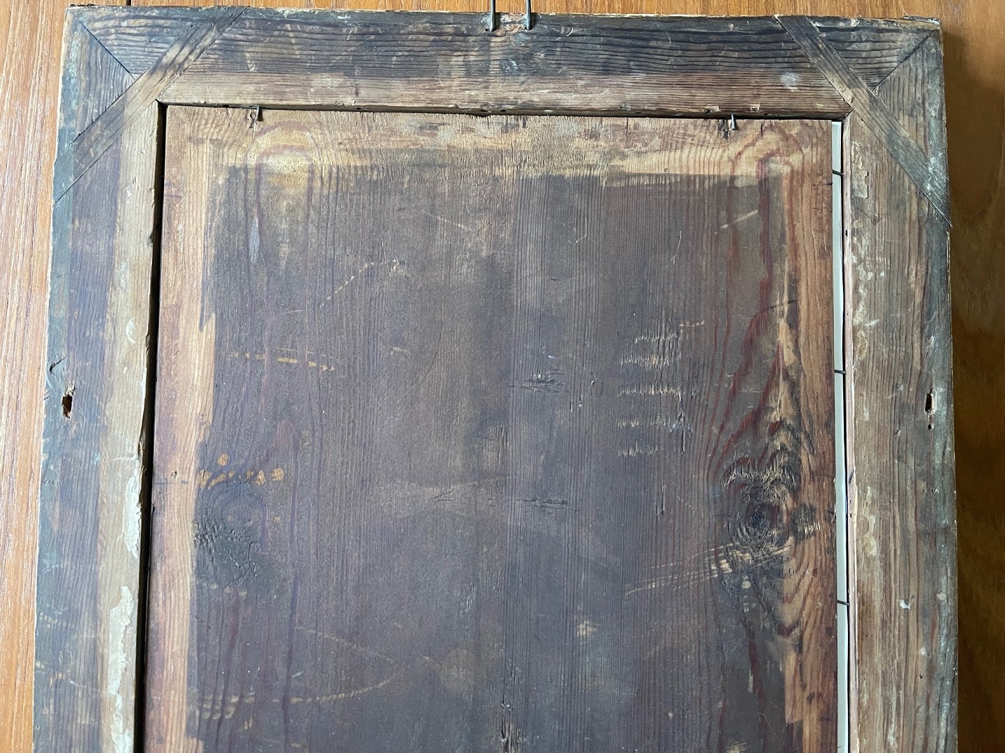 Antik bobinetramme fra det 19. århundrede. Udskåret træ med tylstof og forgyldning. Litografi med følgende tekst:
