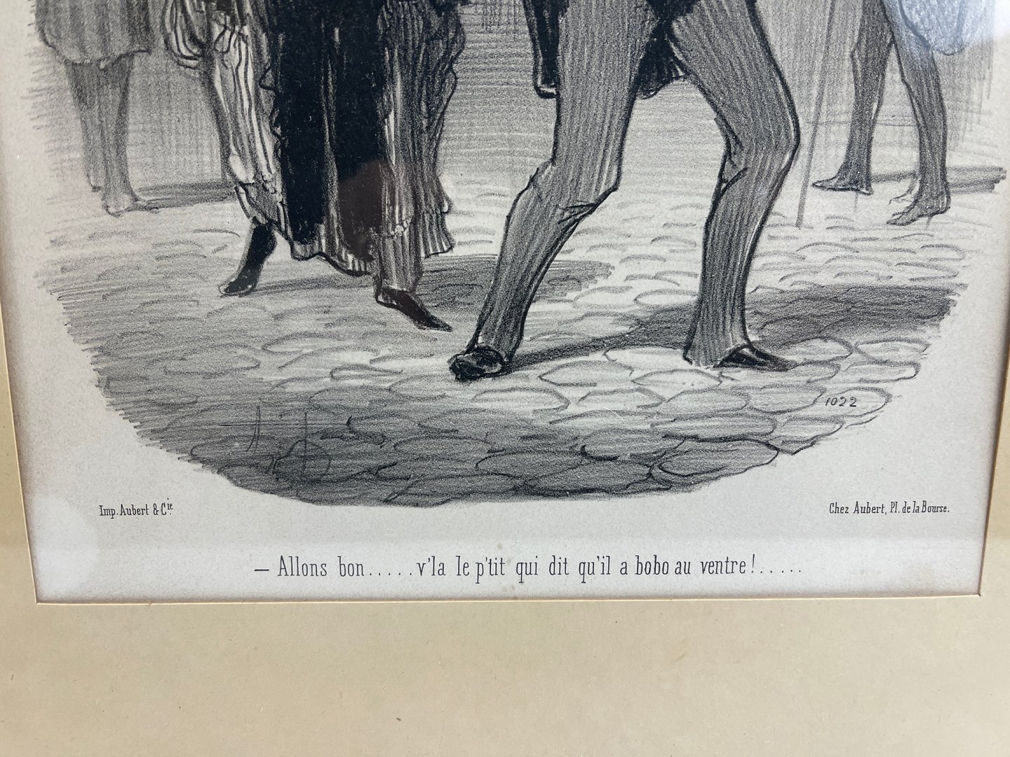 Tryk/litografi fra 1840'erne. Kunstner Honoré Daumier fra serien Le Papas, motiv nr. 13 af far, som bærer sit barn, der har ondt i maven, gennem byen. Signeret i trykket. Trykt hos Chez Aubert, Pl. de la Bourse I 1840'erne i Frankrig. Tekst: Allons bon.....v'la p'tit qui dit qu'il a bobo au ventre!.....