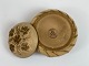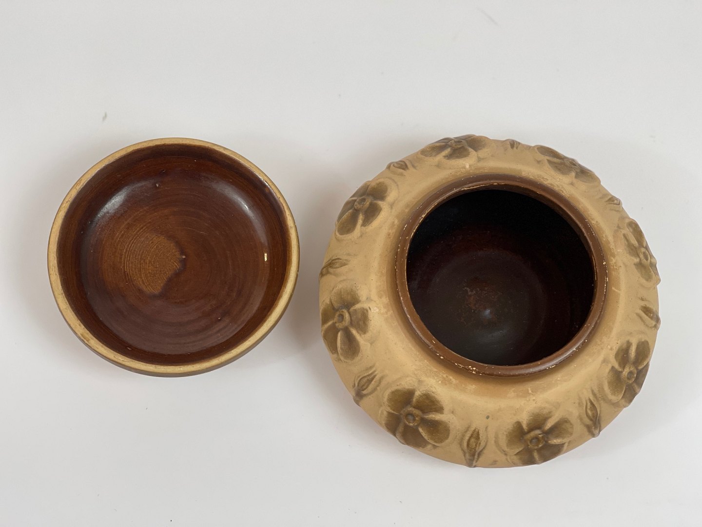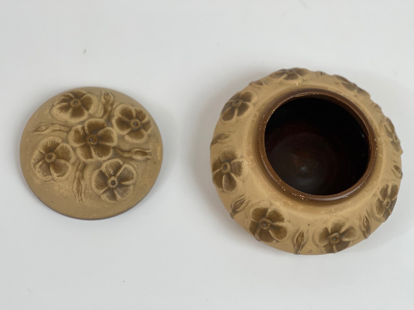 Smuk lav lågkrukke af keramik / lertøj med blomster i jugendstil / skønvirke fra Søholm på Bornholm.