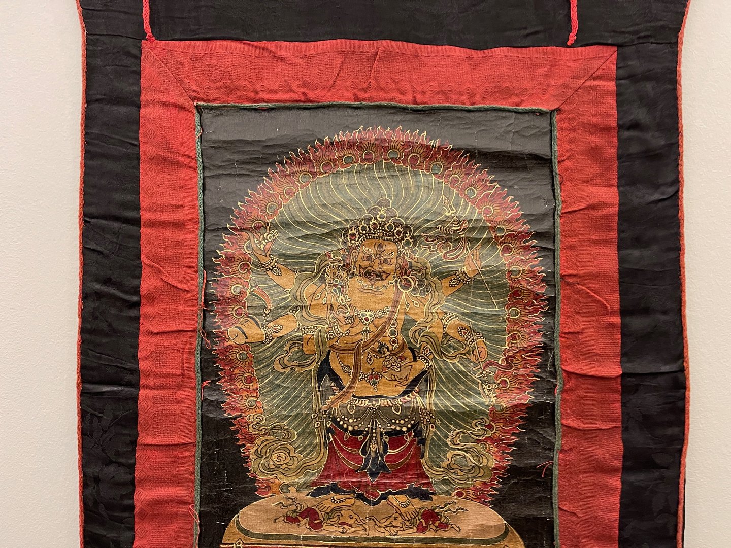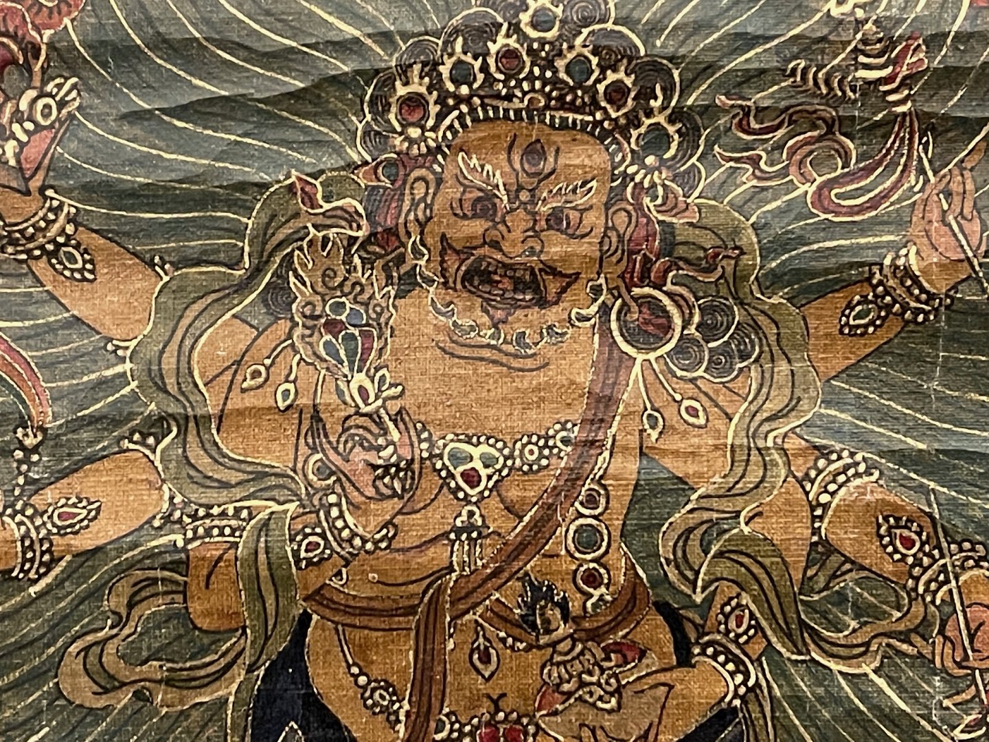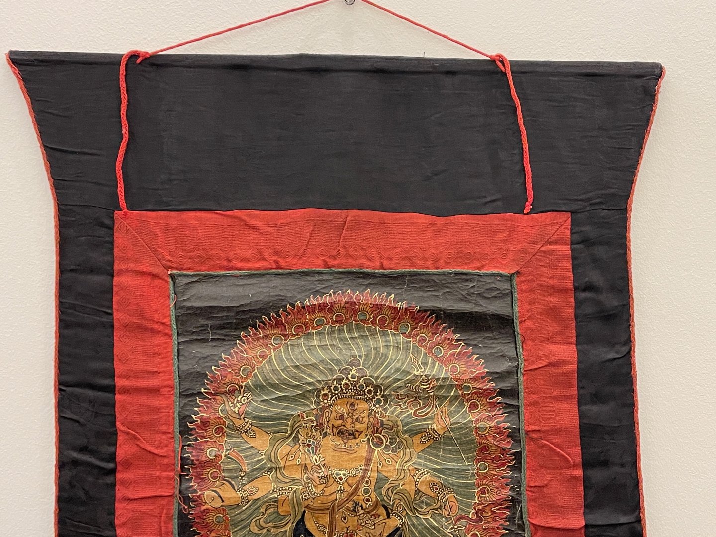Asiatisk buddhistisk Thangka-maleri, håndmalet på lærred, monteret i håndsyet klæde af bomuld og silke, seneste halvdel af det 20. århundrede. Billedet forestiller Yamāntaka / Vajrabhairava (vredens og visdommens gud) på sort baggrund - nogle gange beskrevet som "destroyer of death" eller "conqueror of the lord of death".