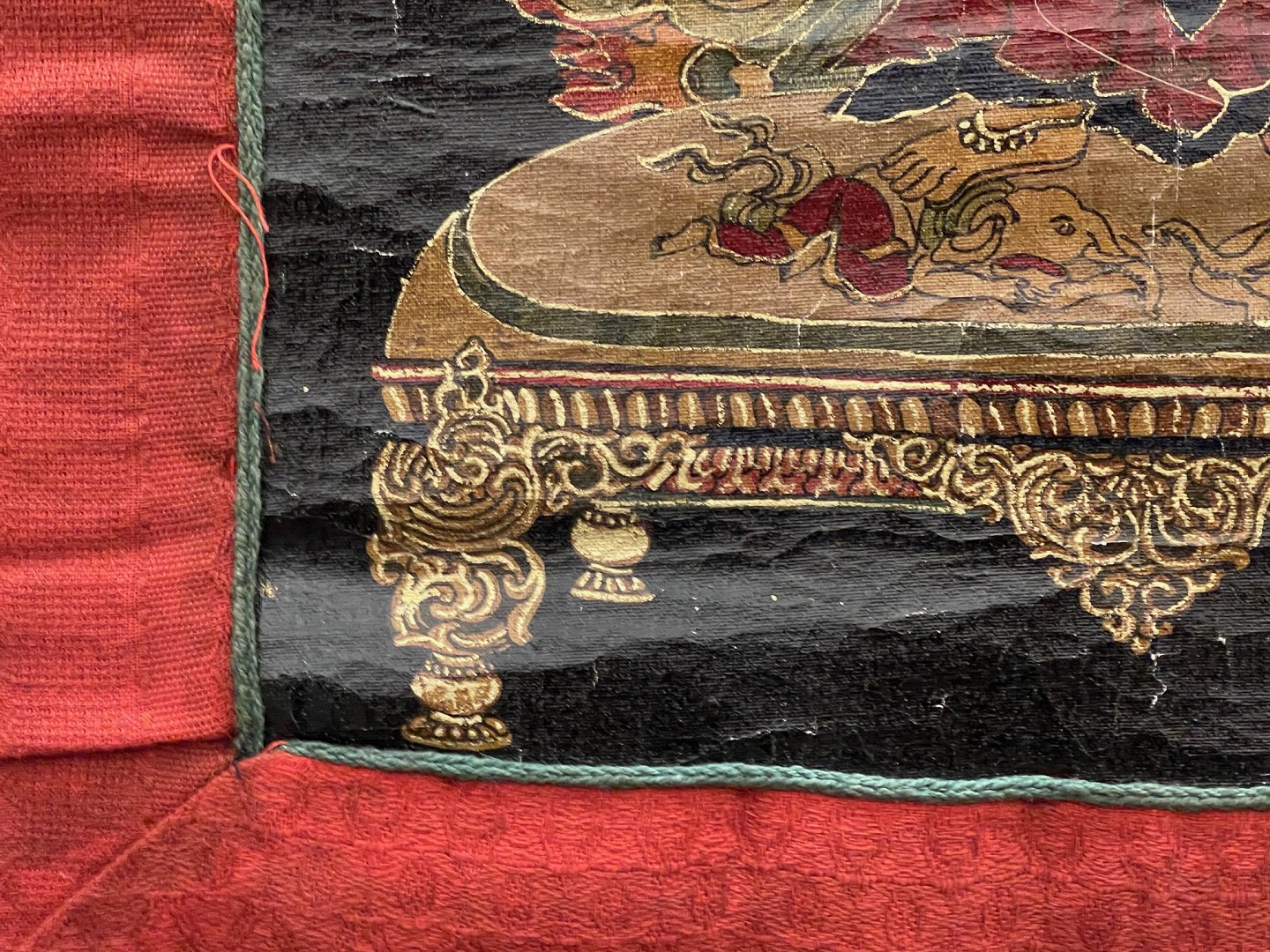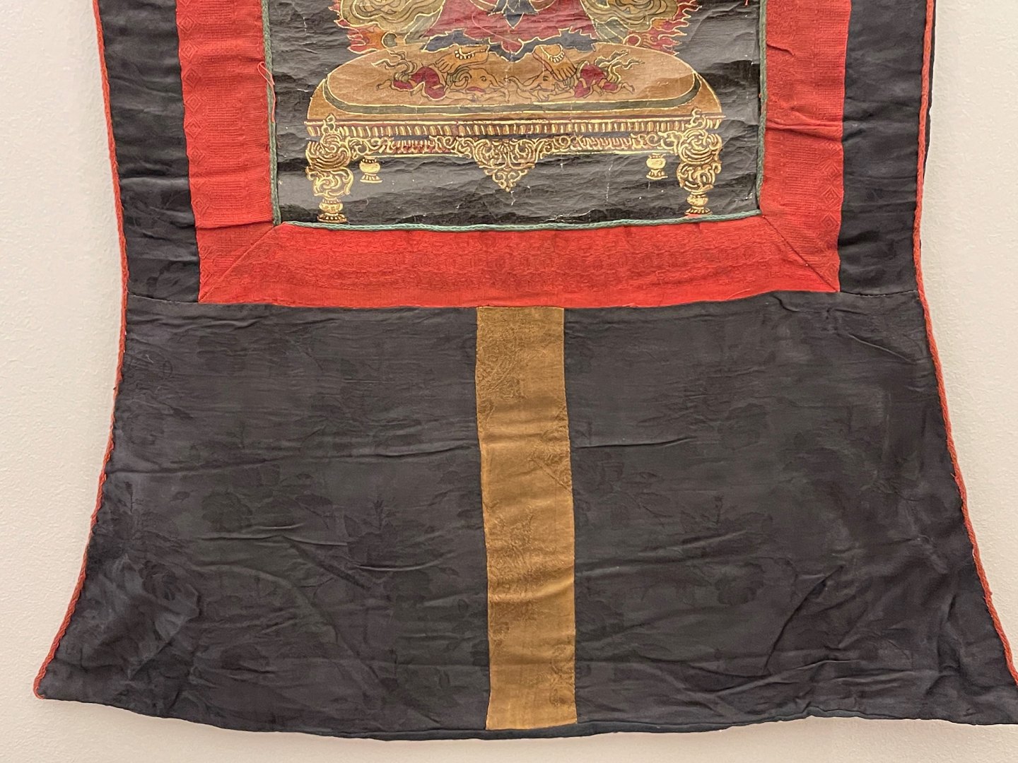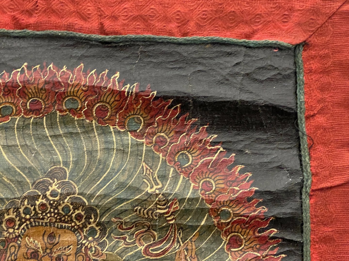 Asiatisk buddhistisk Thangka-maleri, håndmalet på lærred, monteret i håndsyet klæde af bomuld og silke, seneste halvdel af det 20. århundrede. Billedet forestiller Yamāntaka / Vajrabhairava (vredens og visdommens gud) på sort baggrund - nogle gange beskrevet som "destroyer of death" eller "conqueror of the lord of death".