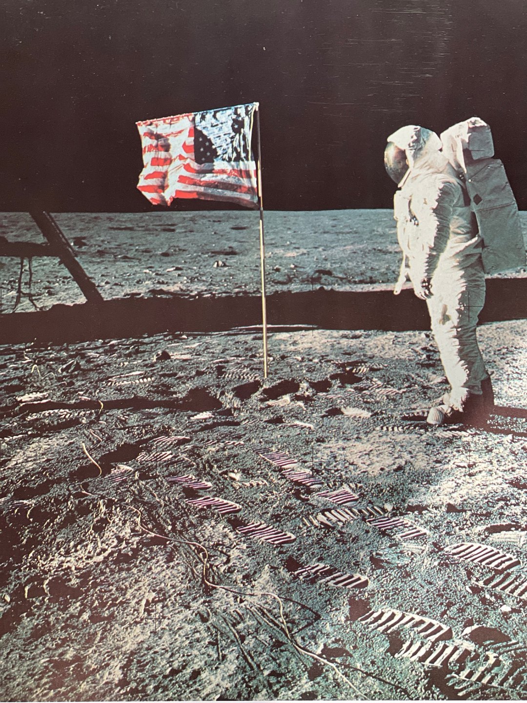 Originalt NASA farveoffsetfotografi / fotoprint fra 1969 af Edwin "Buzz" Aldrin under Apollo-11 månemissionen, der satte de første mennesker på Månen. Aldrin ses ved det amerikanske flag "Old Glory".