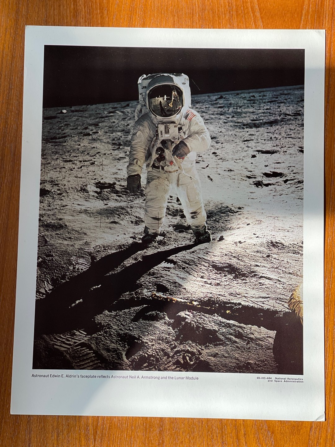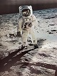 Originalt NASA farveoffsetfotografi / fotoprint fra 1969 af Edwin "Buzz" Aldrin under Apollo-11 månemissionen, der satte de første mennesker på Månen. Aldrin ses på dette berømte foto i månelandskabet, mens fotografen Neil Armstrong spejles i Aldrins visir.