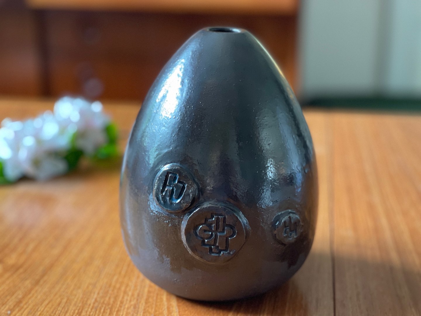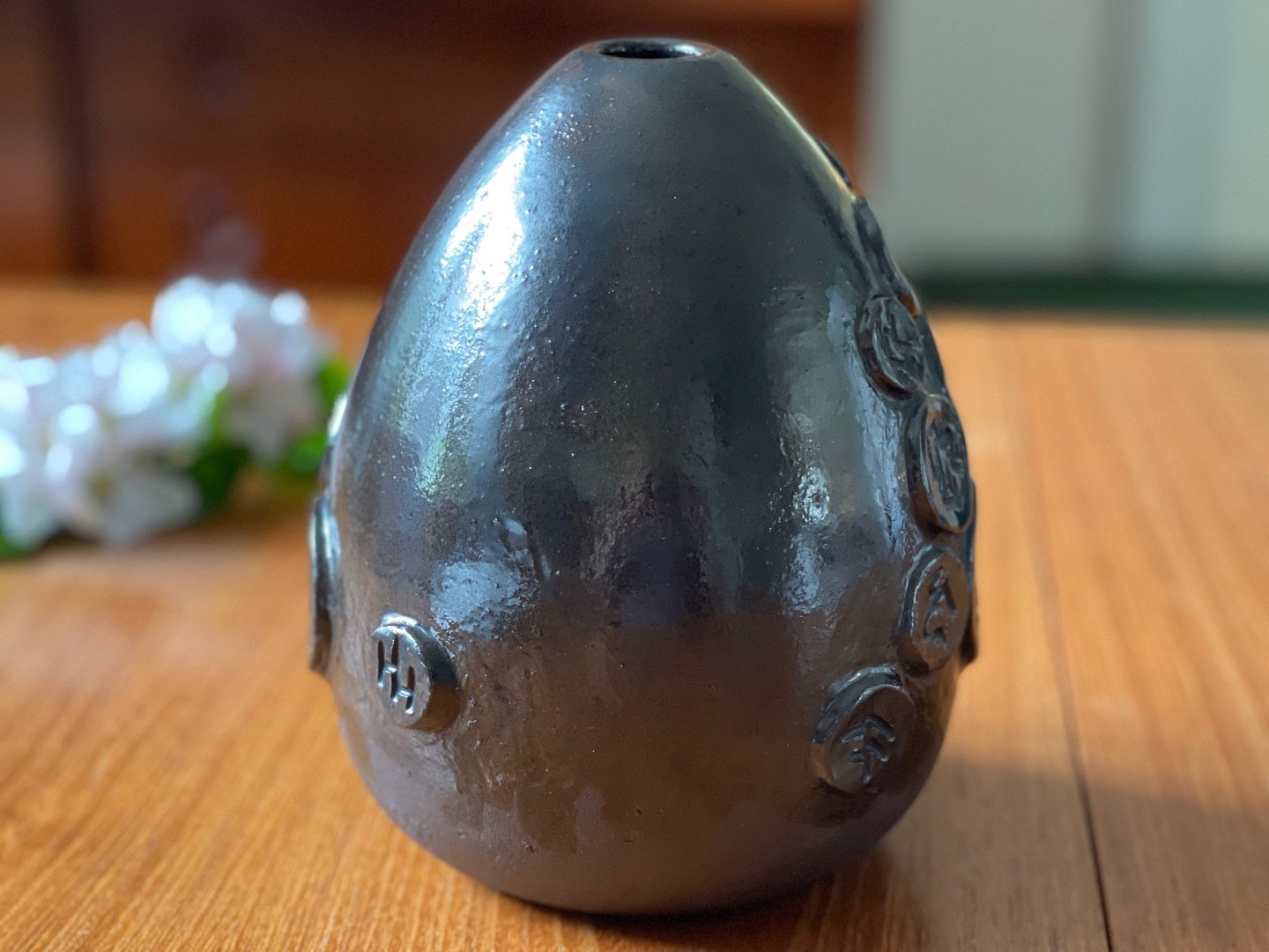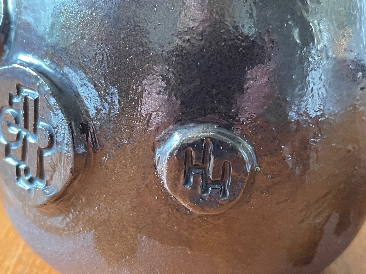 Keramikvase af den bornholmske maler og keramiker Hans Helving. Vasen har en klassisk form og er dekoreret med "medaljoner" eller "segl" i relief. Hvert segl er dekoreret med symboler, og vasen er signeret HH i et af seglene. Den er også signeret i bunden og dateret "65". Det meste af vasen er brunglaseret med blåligt skær i indridsninger i seglene.