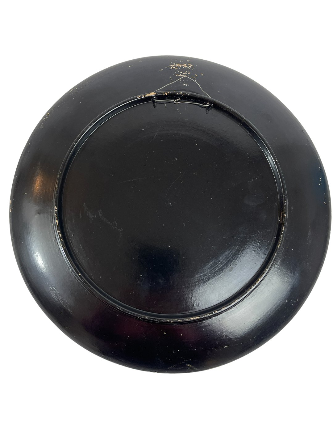 Sort platte med blomstermotiv af stedmoderblomster. Platten er malet sort og derefter dekoreret med motiv af stedmoderblomster. Slitage / patina. Ipsen-stil. Ikke stemplet.