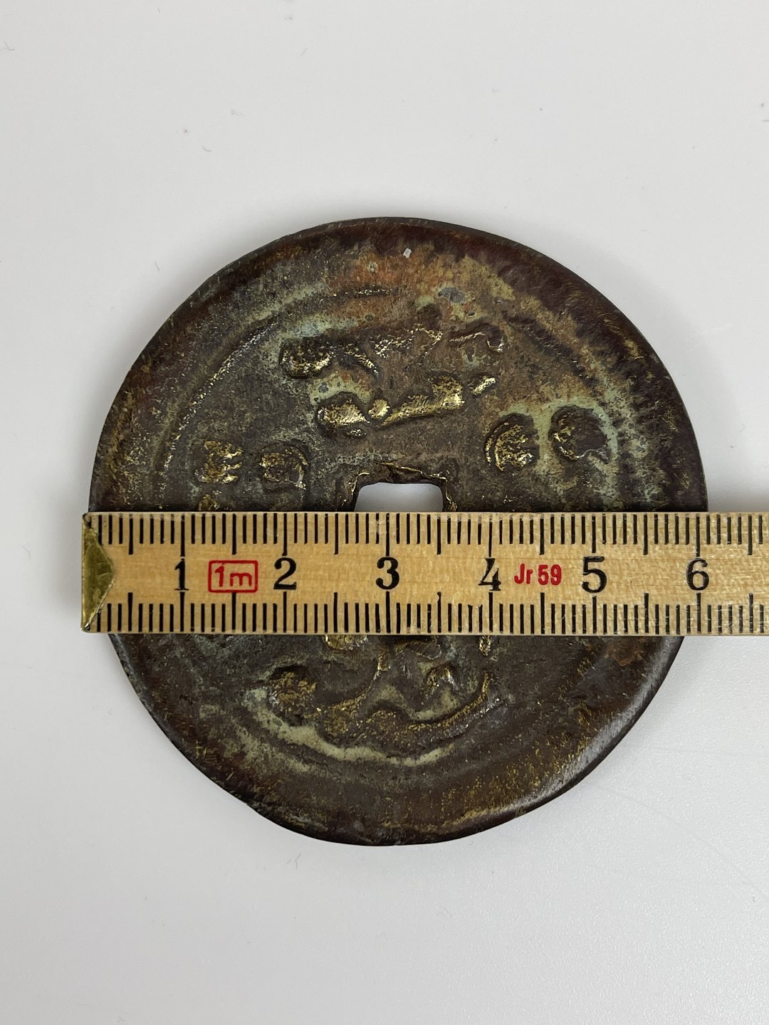 Kinesisk såkaldt bryllupsmønt med med erotiske motiver. Mønten er lavet af metal (messing eller bronze). Læs mere om denne type mønter her: https://en.wikipedia.org/wiki/Marriage_coin_charm