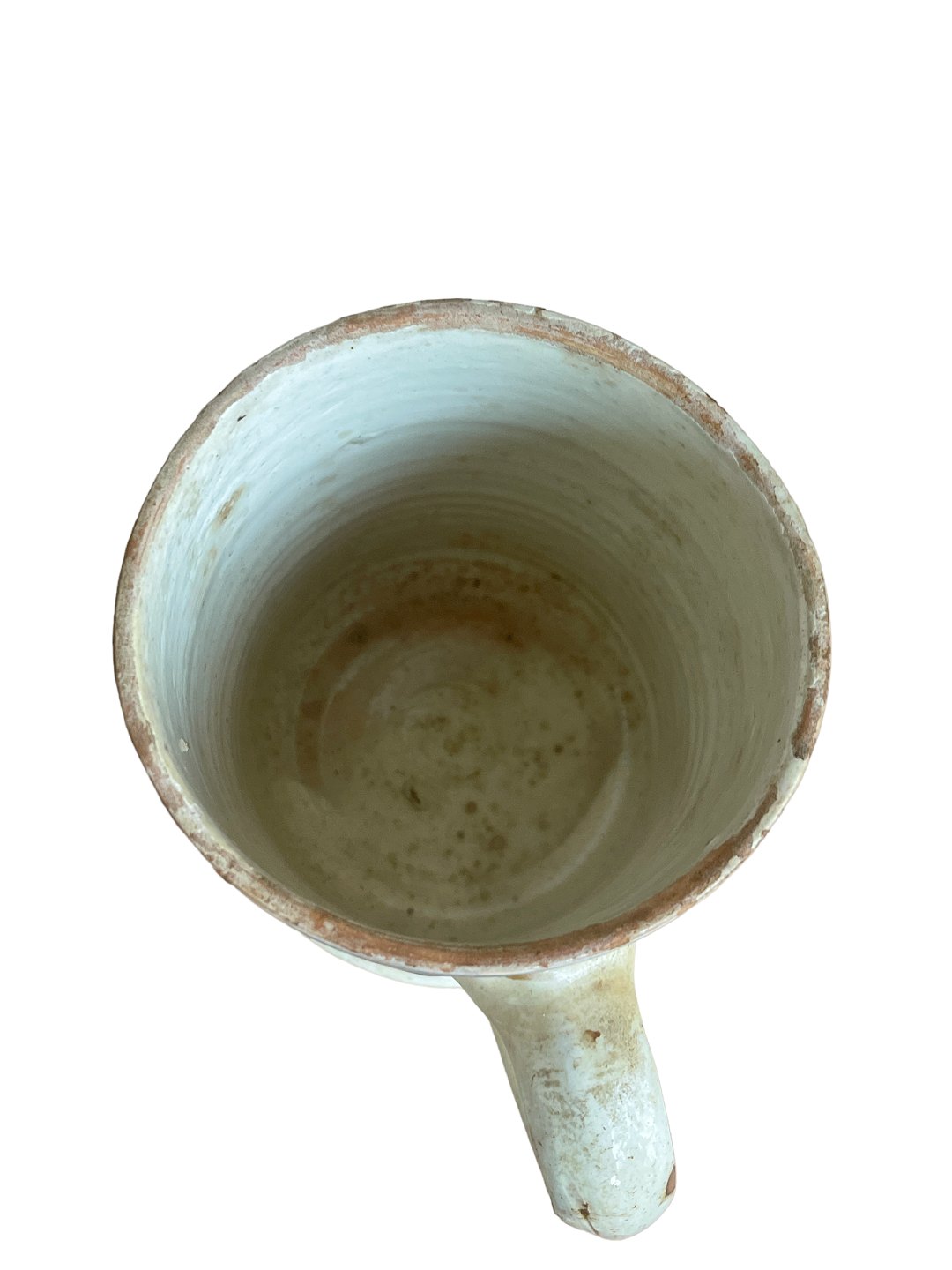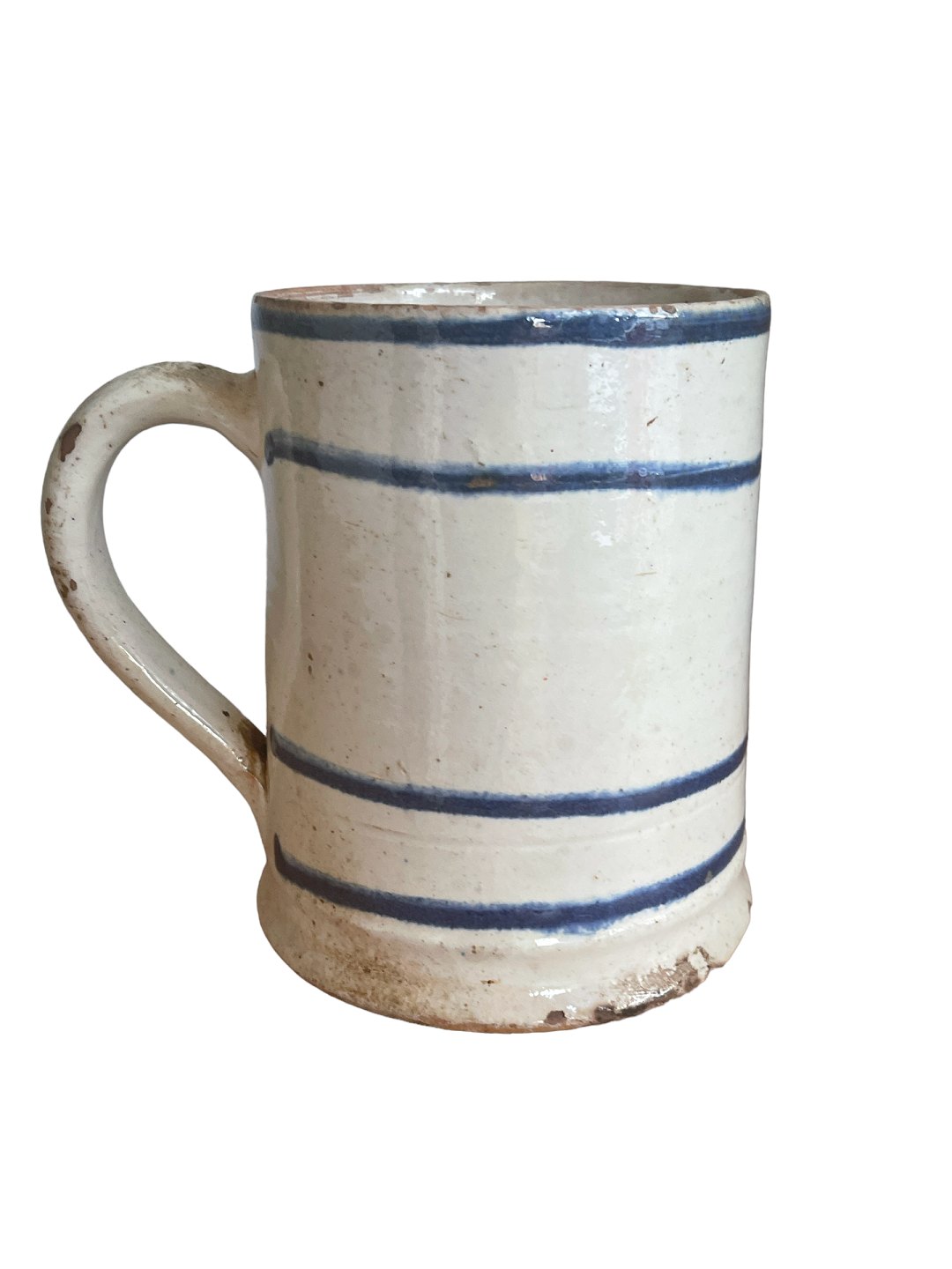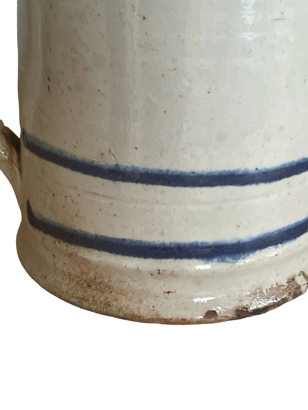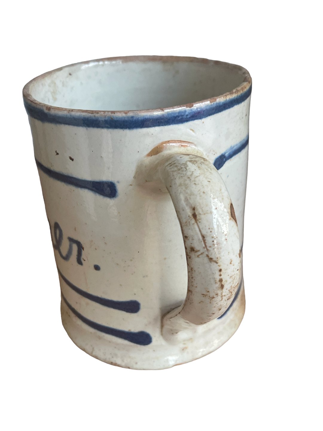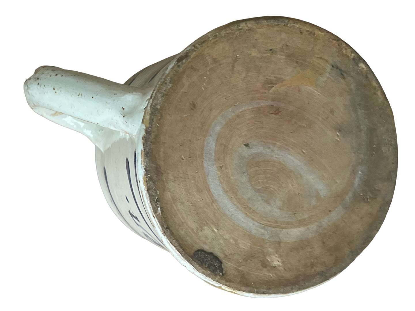 Almue krus af lertøj med hank, Danmark. Hvid begitning med blå bemaling og klar glasur. Sent 1800-tal.