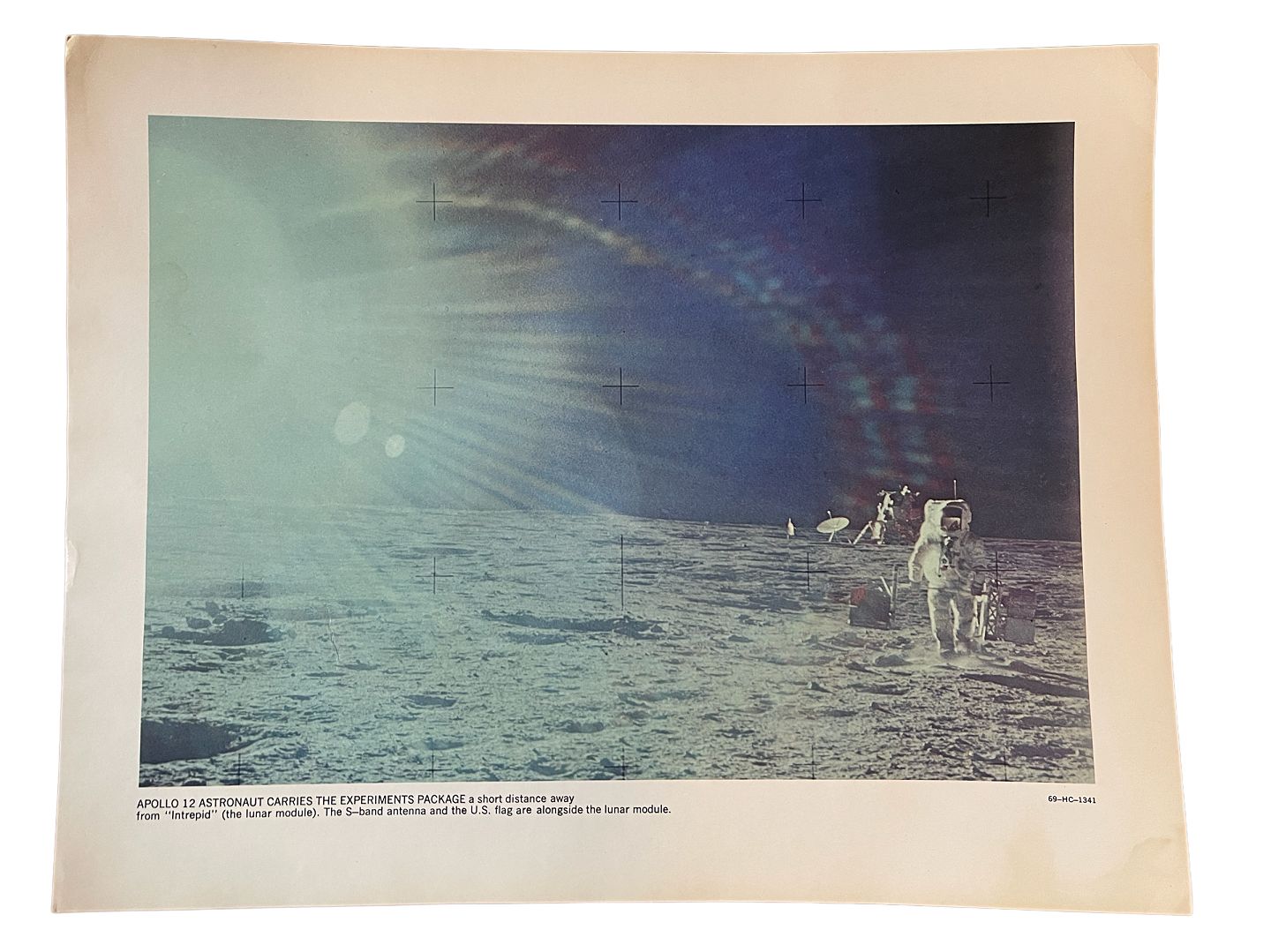 Originalt NASA farveoffsetfotografi fra Apollo 12-missionen af astronaut, der bærer udstyr