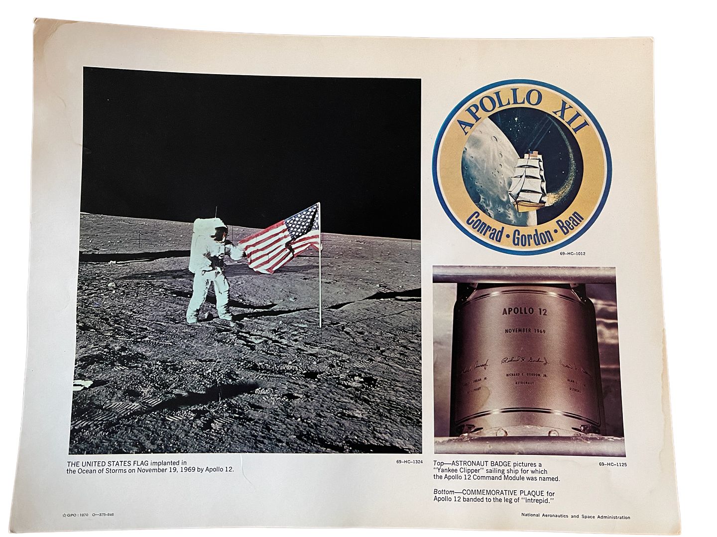 Originalt NASA farveoffsetfotografi fra Apollo 12 månelandingen i november 1969. Billedet viser astronaut Charles Pete Conrad, der holder det amerikanske flag på Stormenes Ocean.
