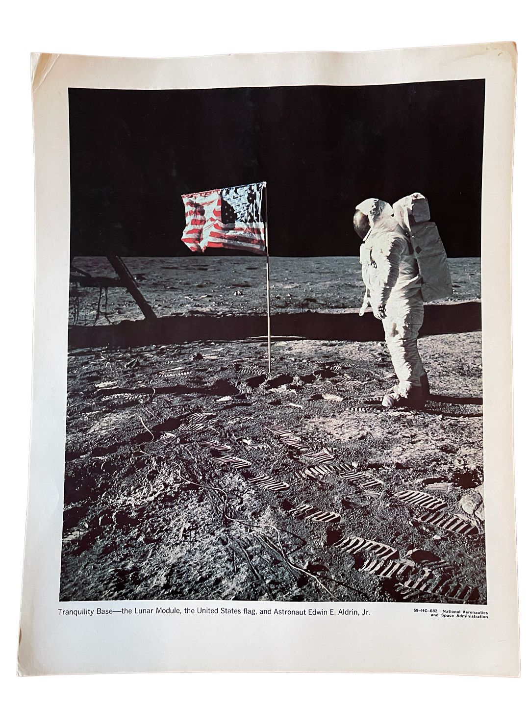Originalt NASA farveoffsetfotografi fra Apollo 11-månelandingen af astronaut Edwin Aldrin, ved siden af det amerikanske flag Old Glory, som han og Neil Armstrong satte på månen i 1969.