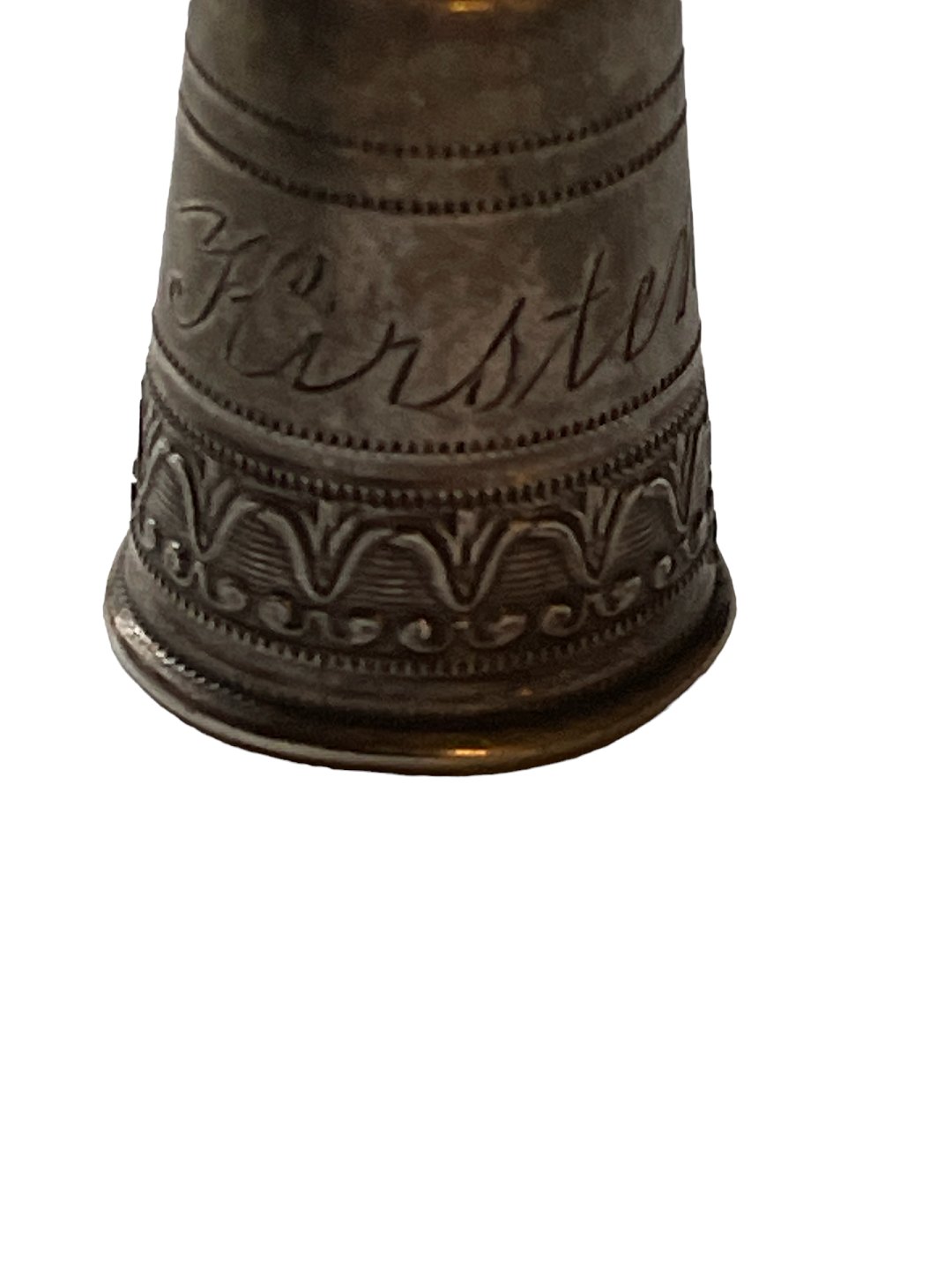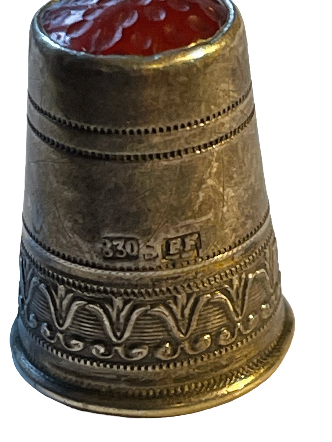 Fingerbøl af sølv med rødt glas i toppen. Stemplet 830 samt mestermærke. Indgraveret "Kirsten".