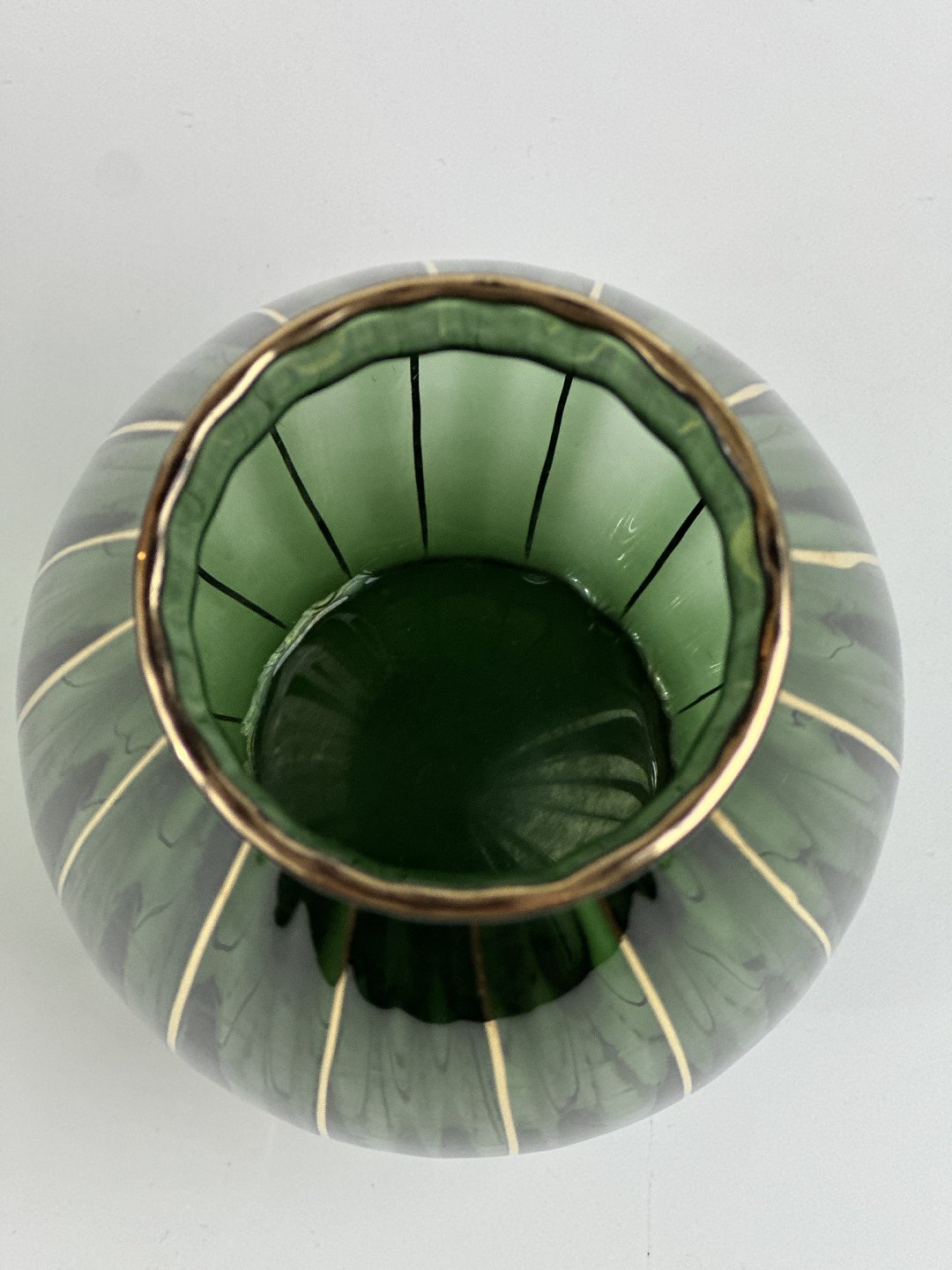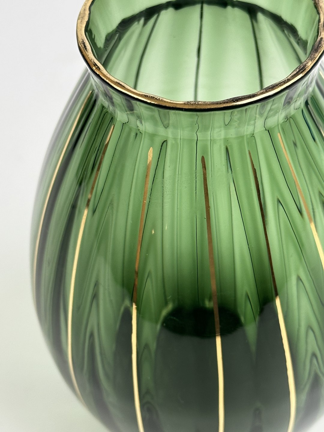 Sjælden vase fra Holmegaard, 1950'erne. Vasen har optiske striber og forgyldning langs nogle af striberne og ved kanten. Vasen er usigneret og tilskrives enten Per Lutken eller Jacob E. Bang.