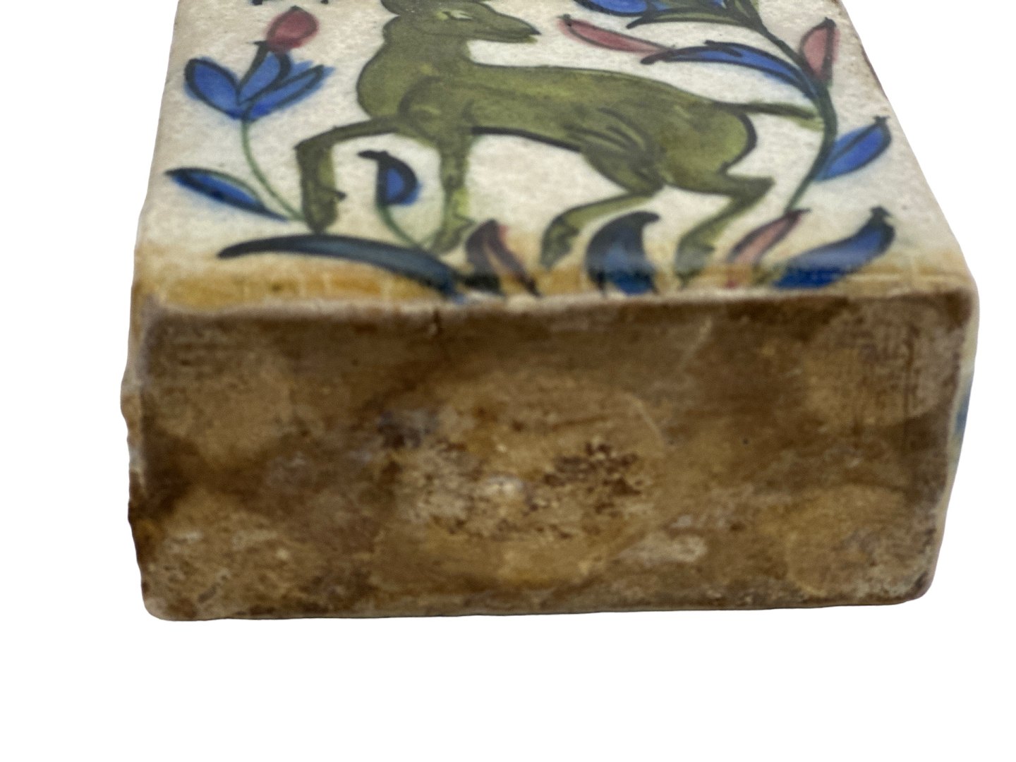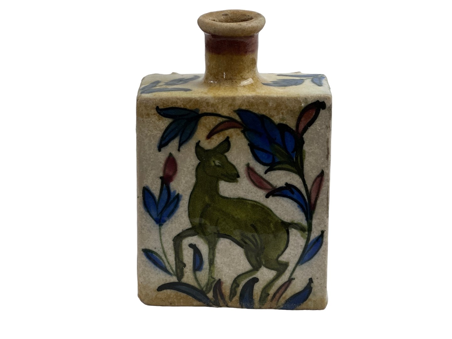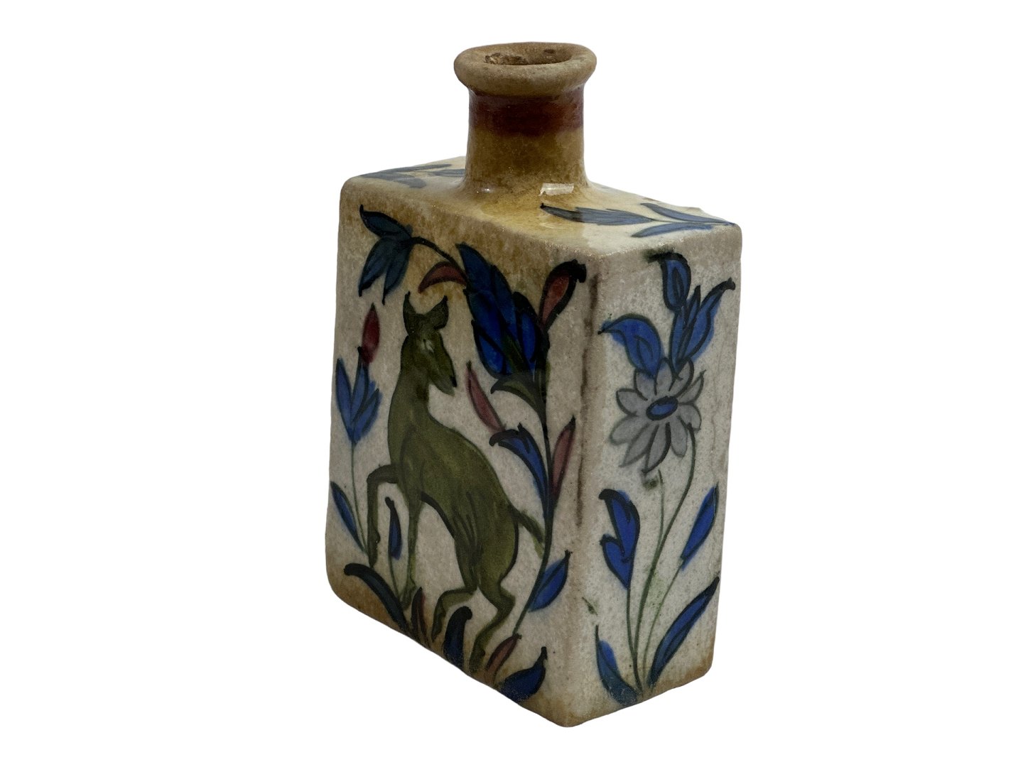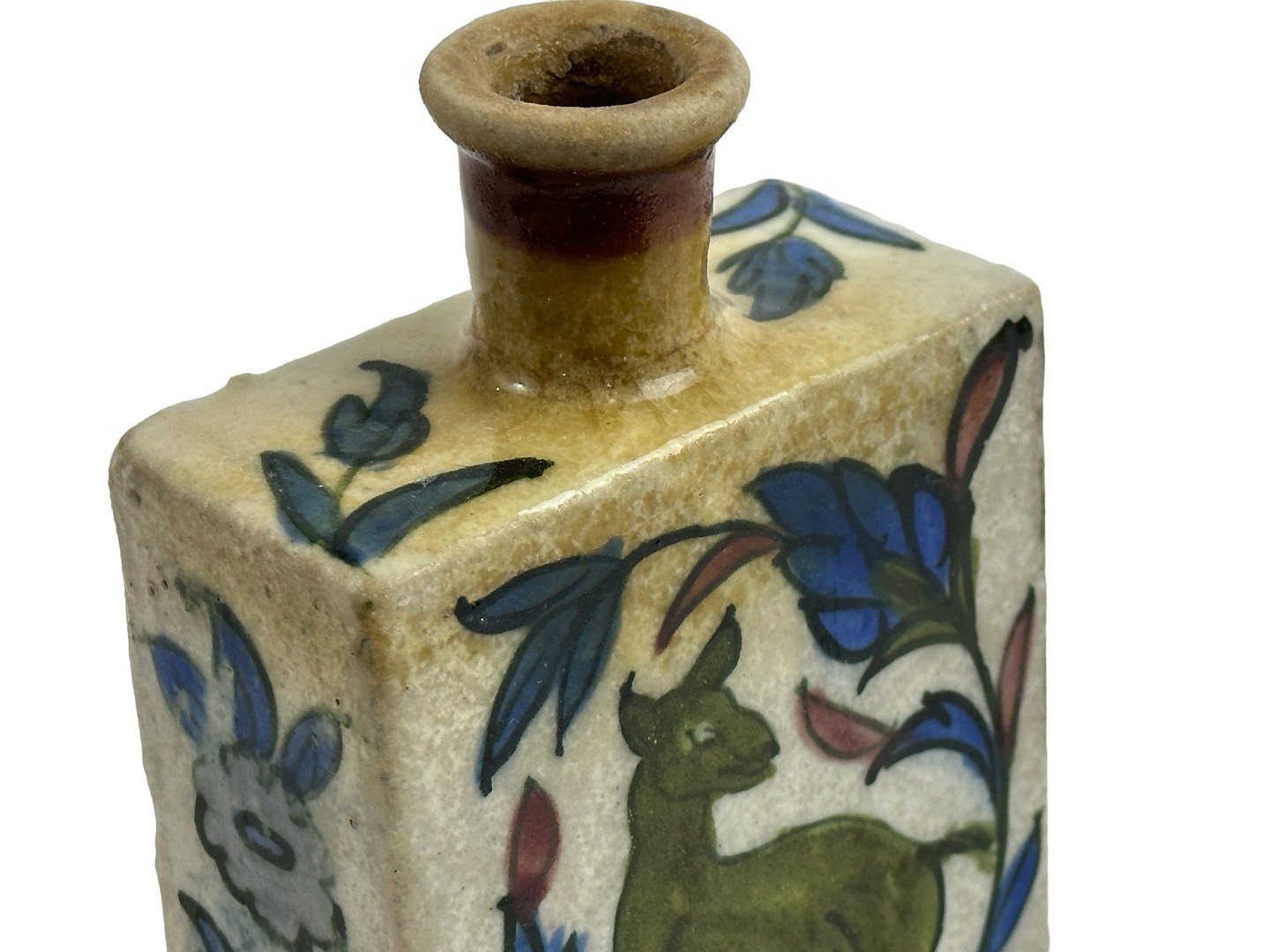Persian bottle-vase, Iznik pottery, Qajar. Polychrome painting with deer, respectively bird on the front and back - as well as flowers and leaves.
