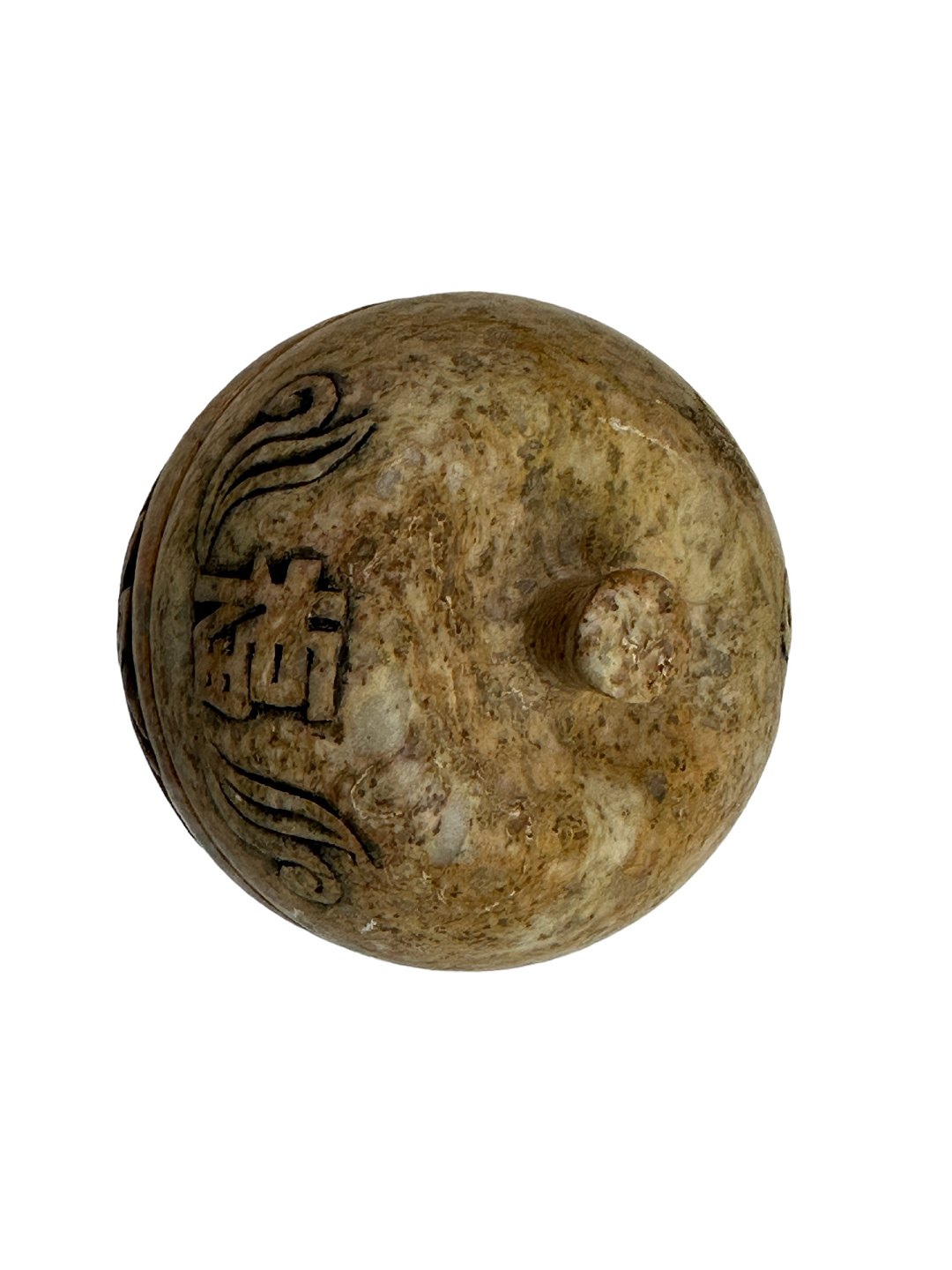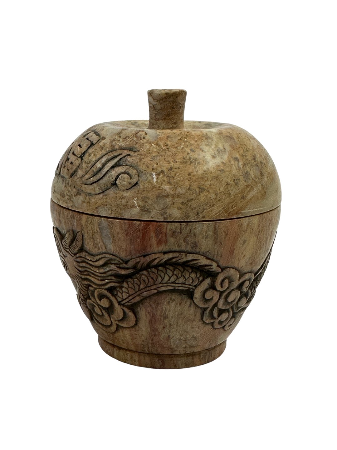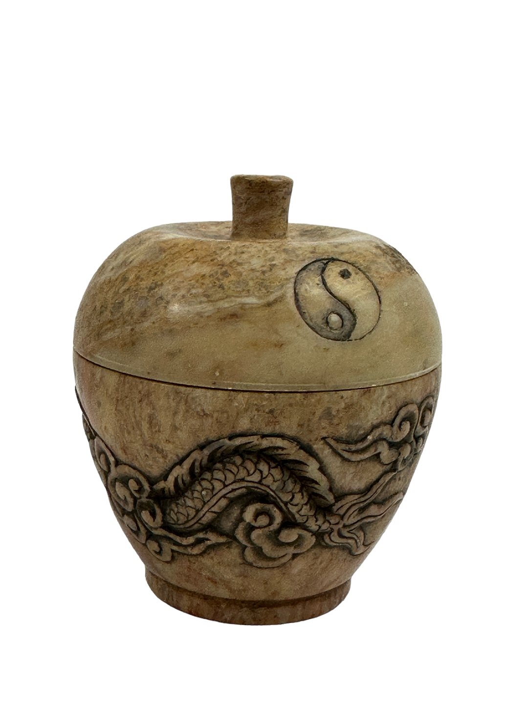 Kinesisk miniature krukke med låg med drage, flammende sol, skriftstegn samt Yin og Yang tegn udskåret i sæbesten. Signeret. 20. århundrede.