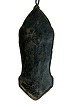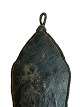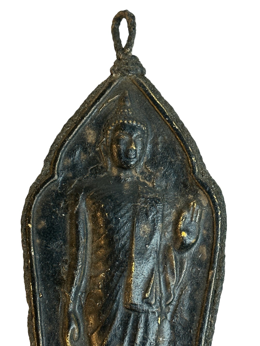Håndlavet, gammelt Buddha-ophæng, husalterfigur/amulet lavet af læder/træ, lak og snor med motiv af gående Buddha. Phra Leela (Walking Buddha). Antageligt Thailand.