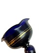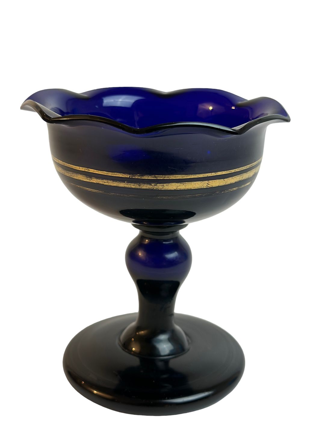 Kandisskål, sukkerskål, sukkerfad. Blåt glas med guldstribe. Bølget kant.