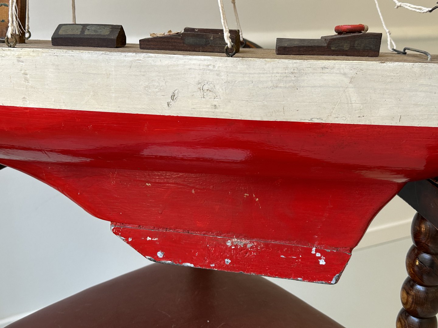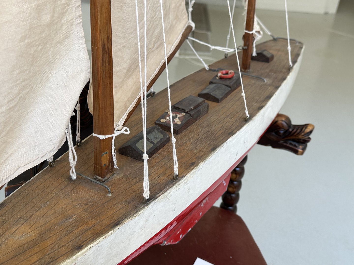 Gammelt sejlskib, som man kan sejle med på en sø - en Pond Yacht. Formentligt originale sejl, som er slidte, men som vi har vasket og surret på med ny snor. Et fint, gammelt skib, 20. århundrede.