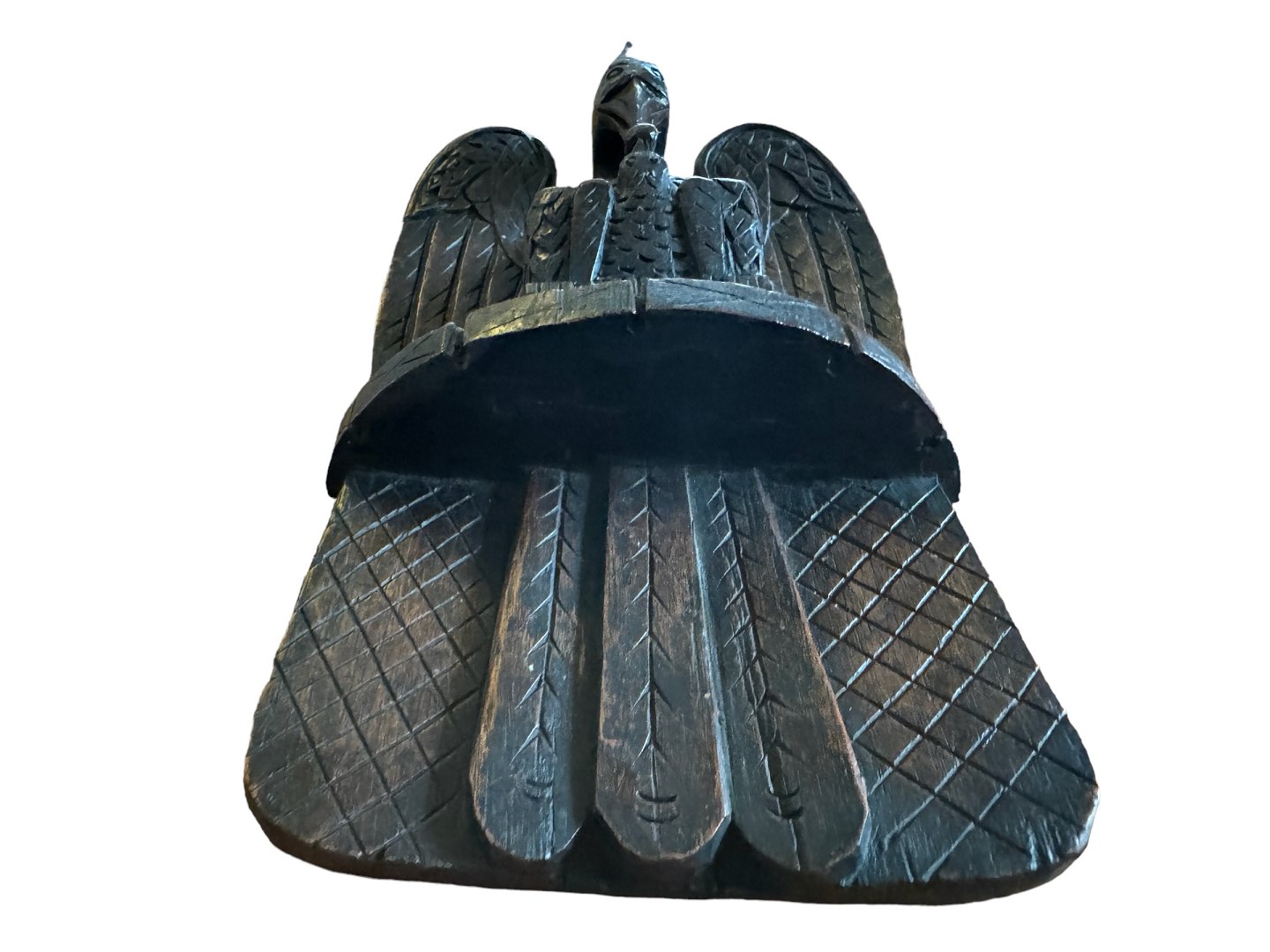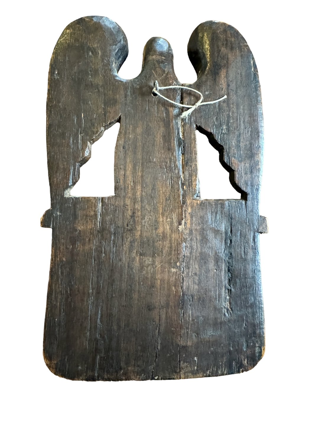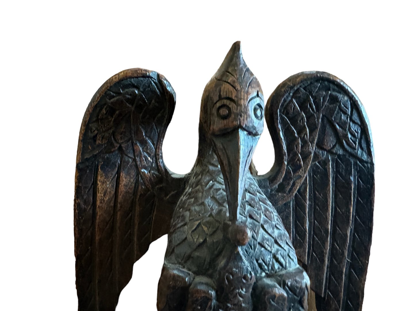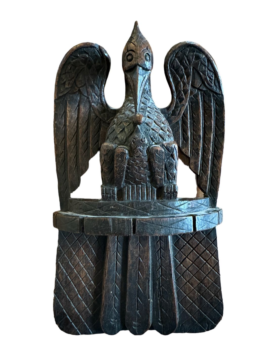 Antik, europæisk håndsnittet vægophæng / skeholder af pelikan, der fodrer sin unge. Der er tale om et symbol på Jesu Kristus’ offer og kærlighed til menneskeheden. Symbolet stammer fra en ældgammel legende, der antog, at pelikanen ville såre sig selv for at fodre sine unger med sit eget blod, hvis der ikke var anden føde tilgængelig.