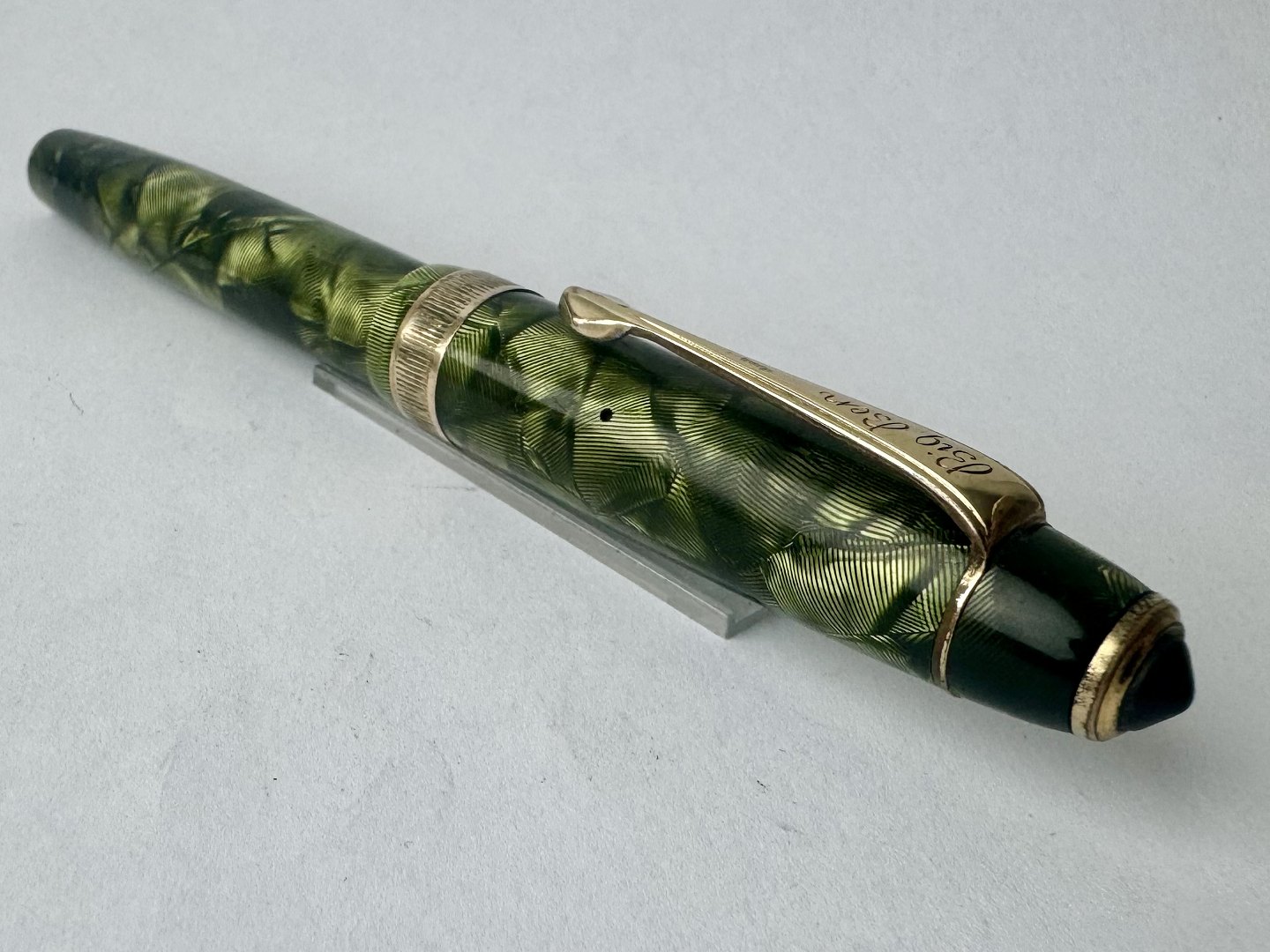 Large green marbled Big Ben fountain pen With wide ribbed belly band on the cap. Appears in good condition with all original Big Ben parts, including a 14 carat gold nib. Before the fountain pen can absorb ink and write again, a new rubber bladder must be inserted. This task can be carried out for an additional charge of DKK 200. Length: 13.6 cm