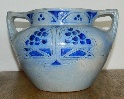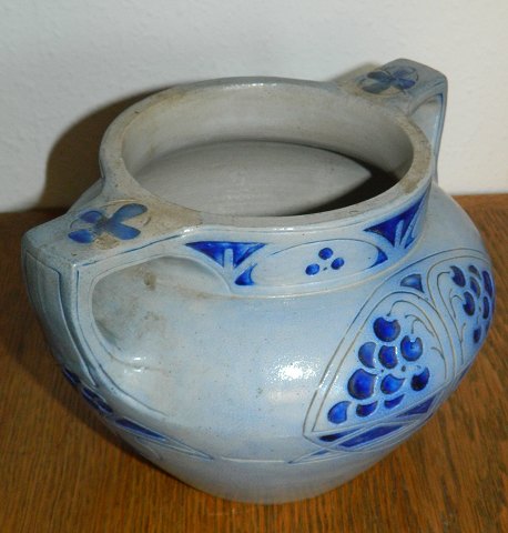 Vase i stentøj med hanke - Tysk blå saltglaseret vase i stentøj fra begyndelsen af 20. århundrede. Dekoreret i jugendstil. Fremstår i perfekt stand. Ubekendt fabriksmærke på bunden. 16½ cm høj og 23 cm fra øre til øre.