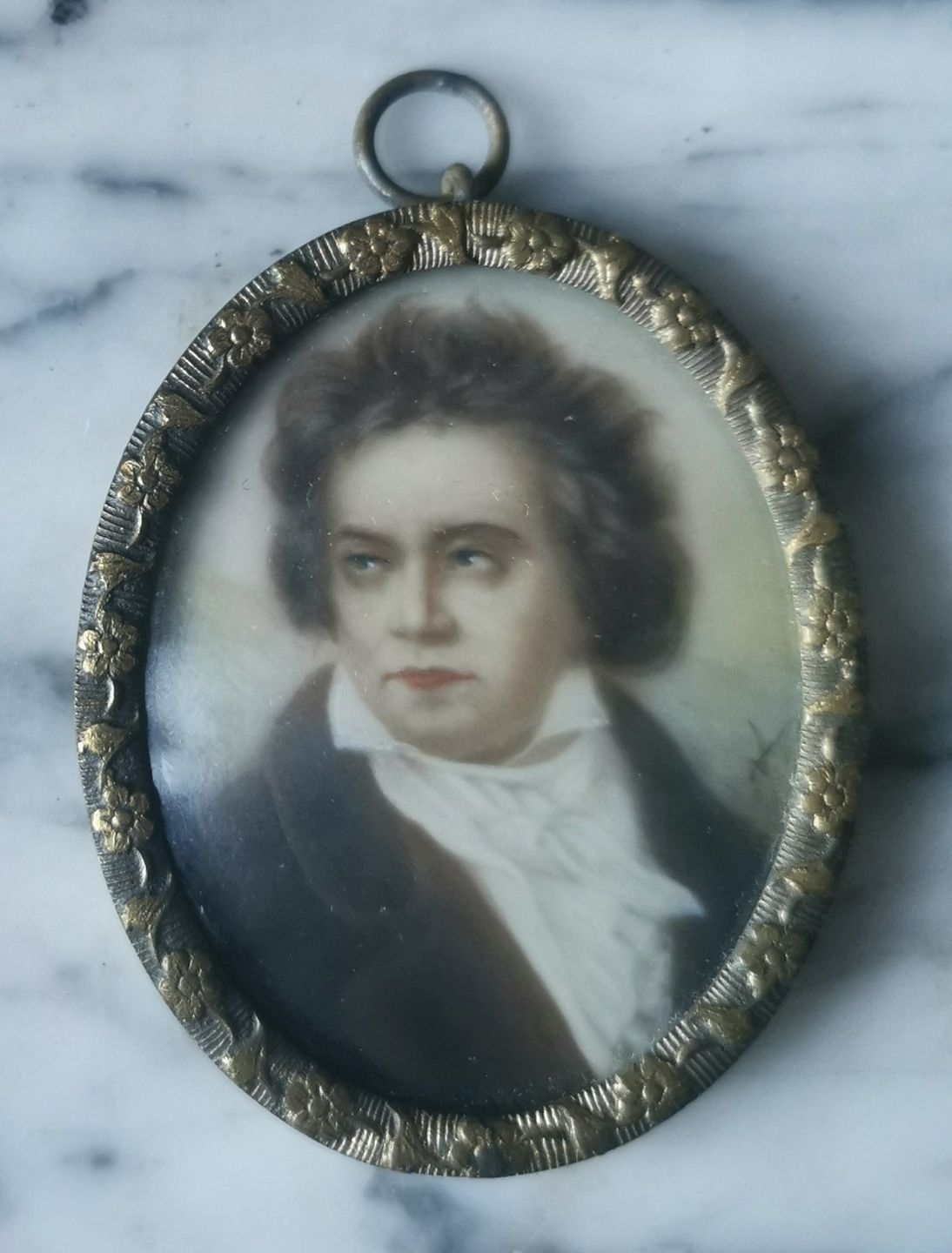 Håndmalet miniature portræt af komponisten og pianisten Ludwig van Beethoven (1770-1827) monteret i metalramme. I god stand uden skader eller reparationer. Mål: H. 5½ cm B. 4½ cm.