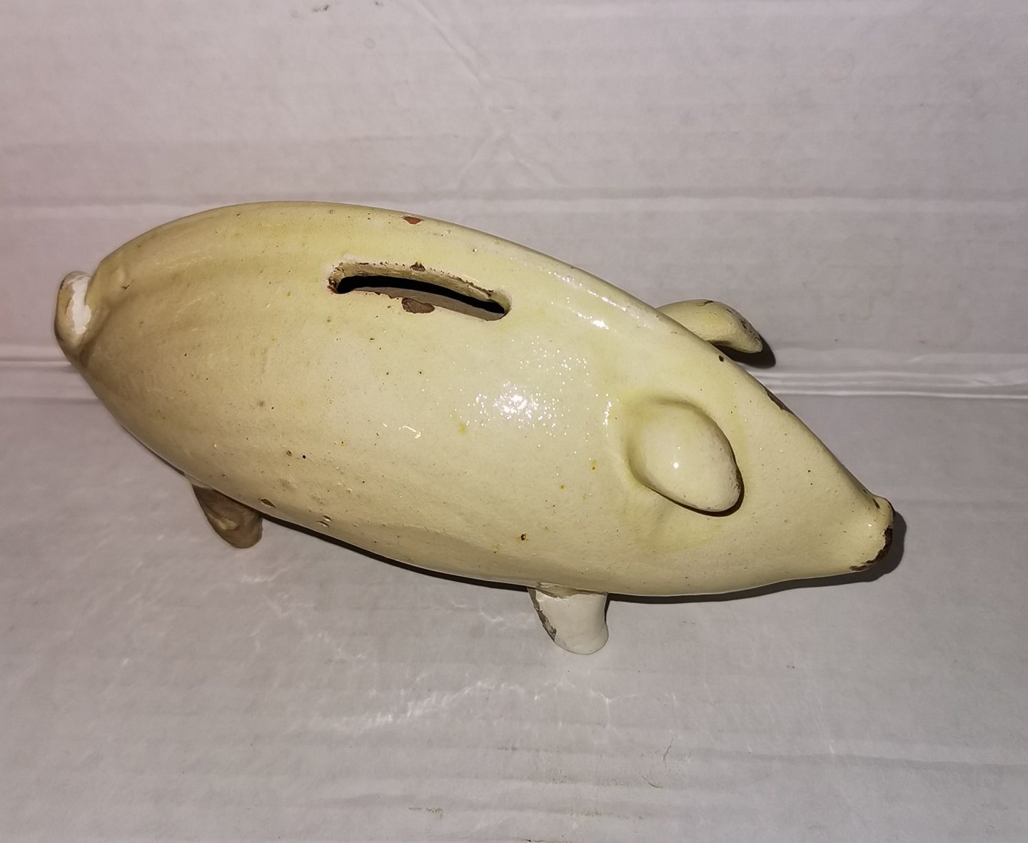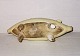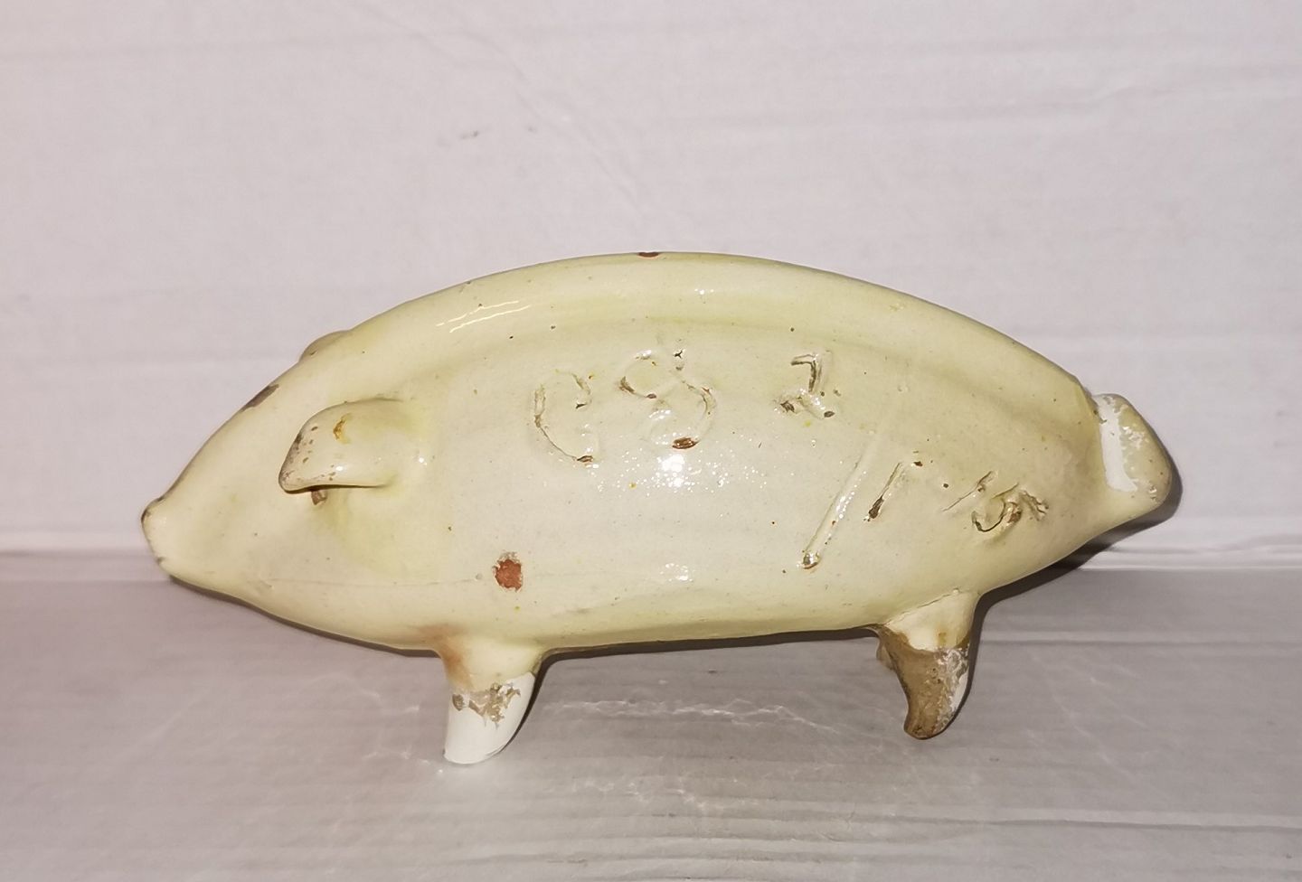 Danks sparegris i glaseret lertøj. Fremstår i god stand med lidt overflade brugsspor. På siden indgravering bl.a. 1915. Mål: H. 8 cm L. 18 cm