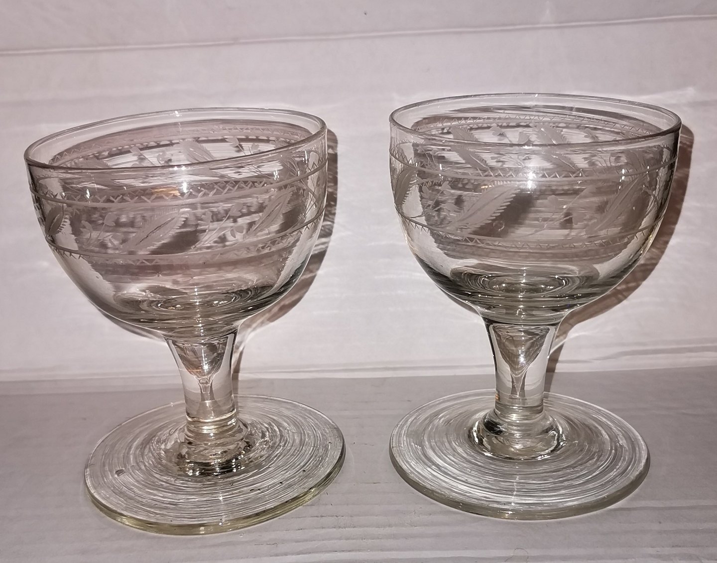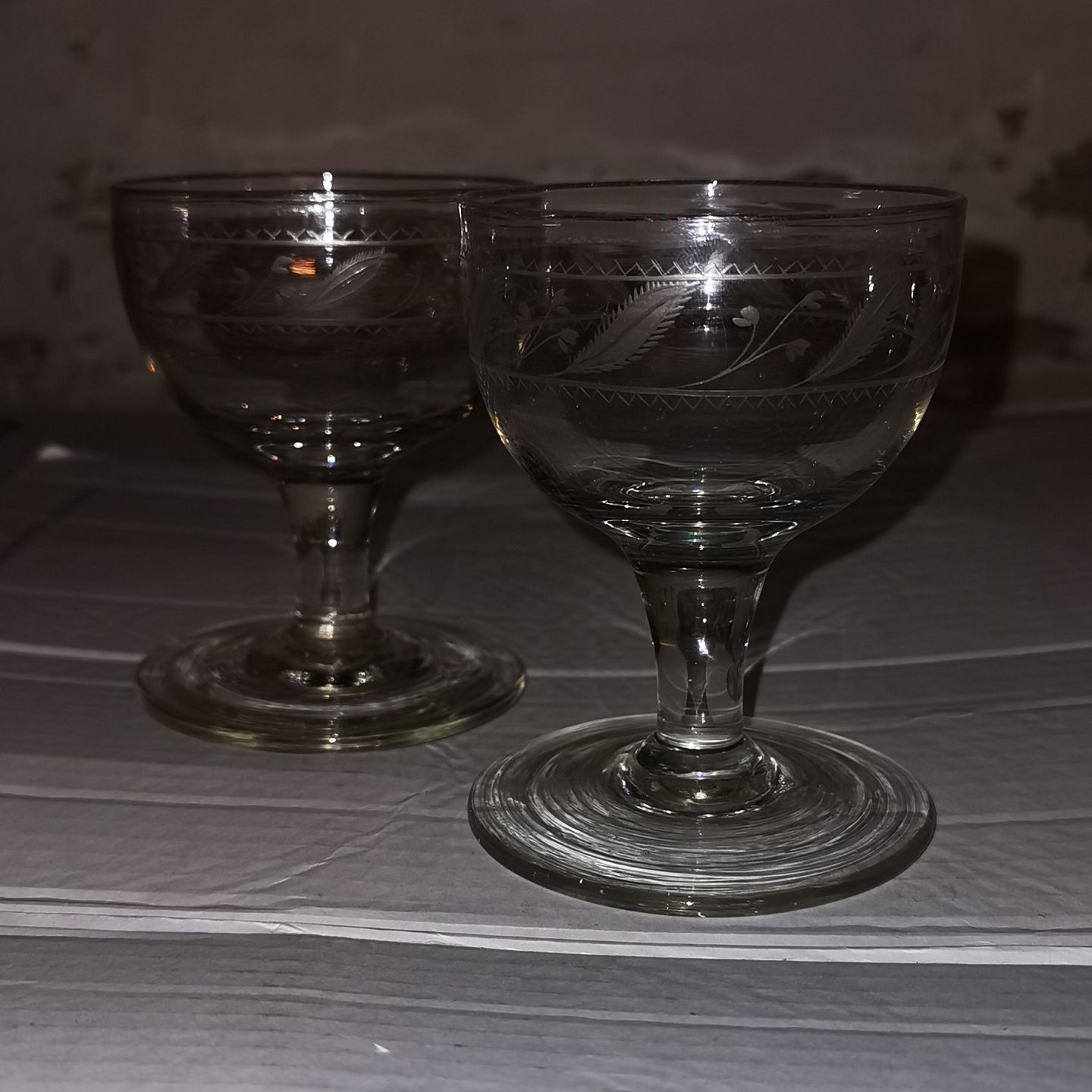 Par engelske vinglas fra omkring 1840. Dekoreret med slibning rund om kummen. I perfekt stand. H. 10½ cm. Åbningen samt foden har samme diameter på 8 cm.