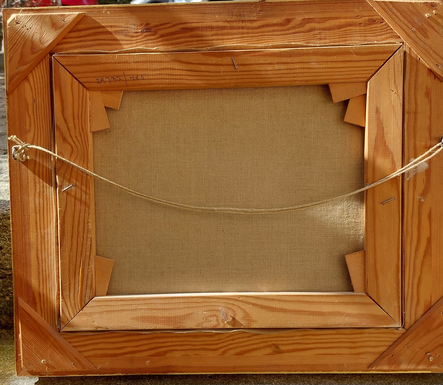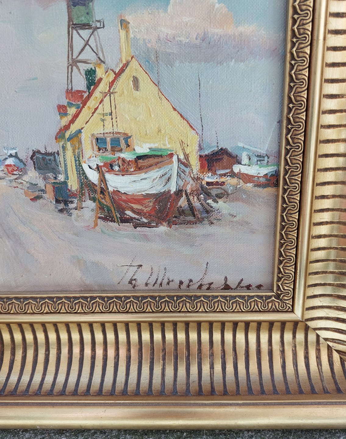 Oliemaleri på lærred. Havnemotiv fra Dragør af Theodor Ulrichsen (1905-1970). Mål: 44,5 x 53,5 cm. Mindre defekt i øverste venstre hjørne.