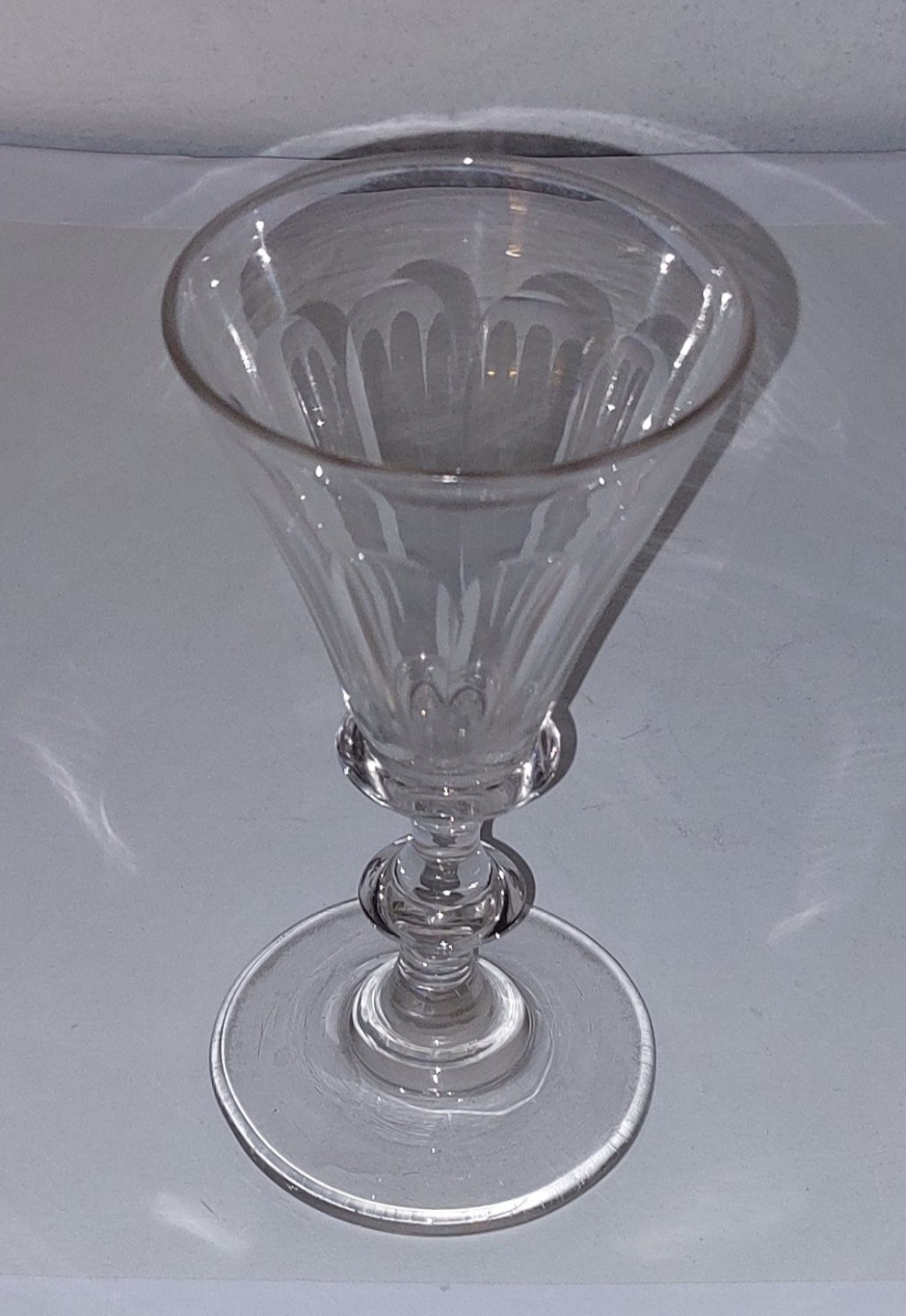 Anglais glas til vin. Kræmmerhusformet kumme med facetslibninger. På stilken en "knap". Fremstår i perfekt stand. H. 13 cm.
