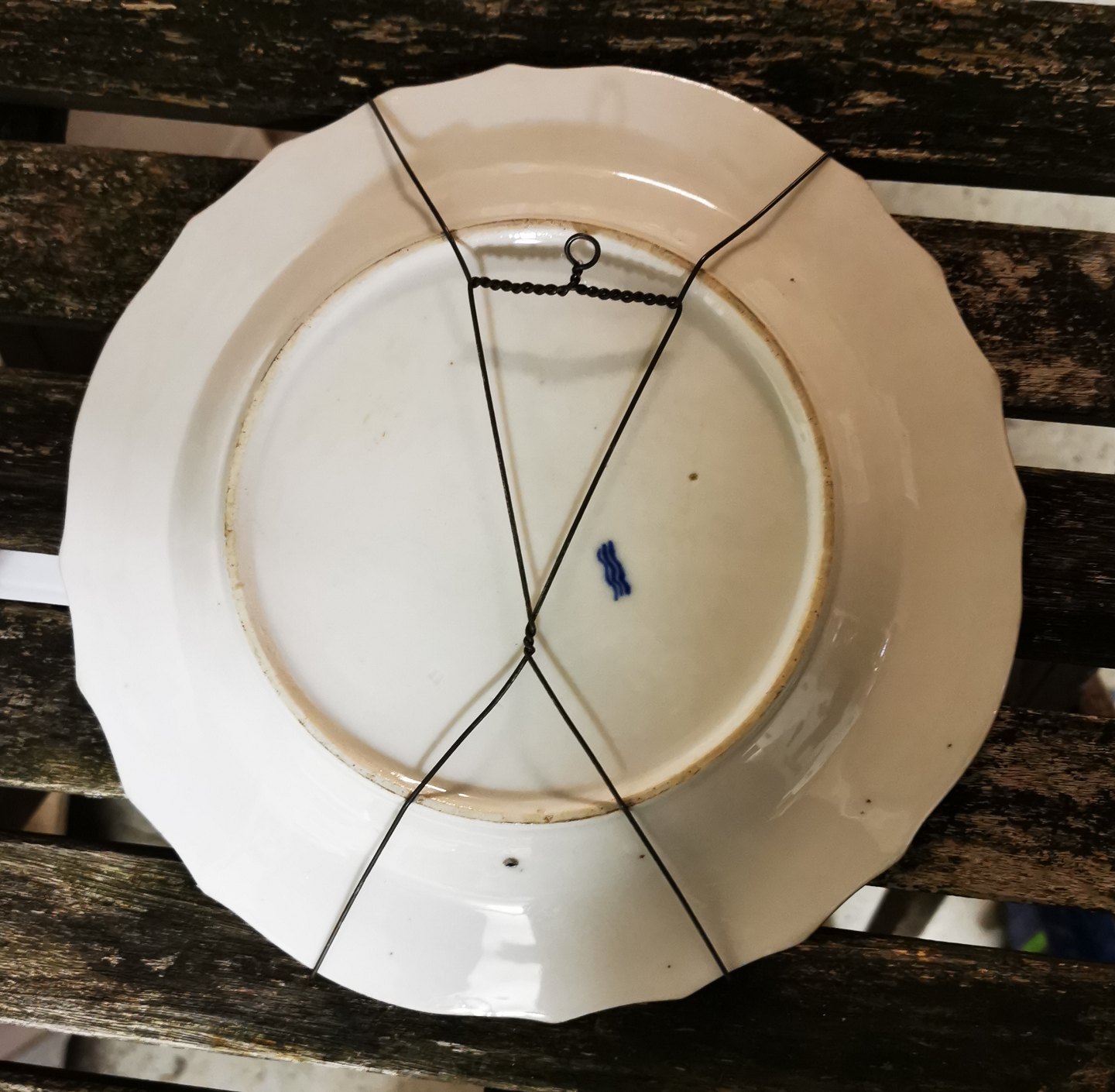 Tallerken i porcelæn fra Ca. 1850 med blomsterdekoration samt sommerfugl og mariehøne. I god stand uden skader eller reparationer. Fabriksmærket på bagsiden med fabrikkens velkendte tre bølger. Ø. 25,5 cm