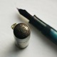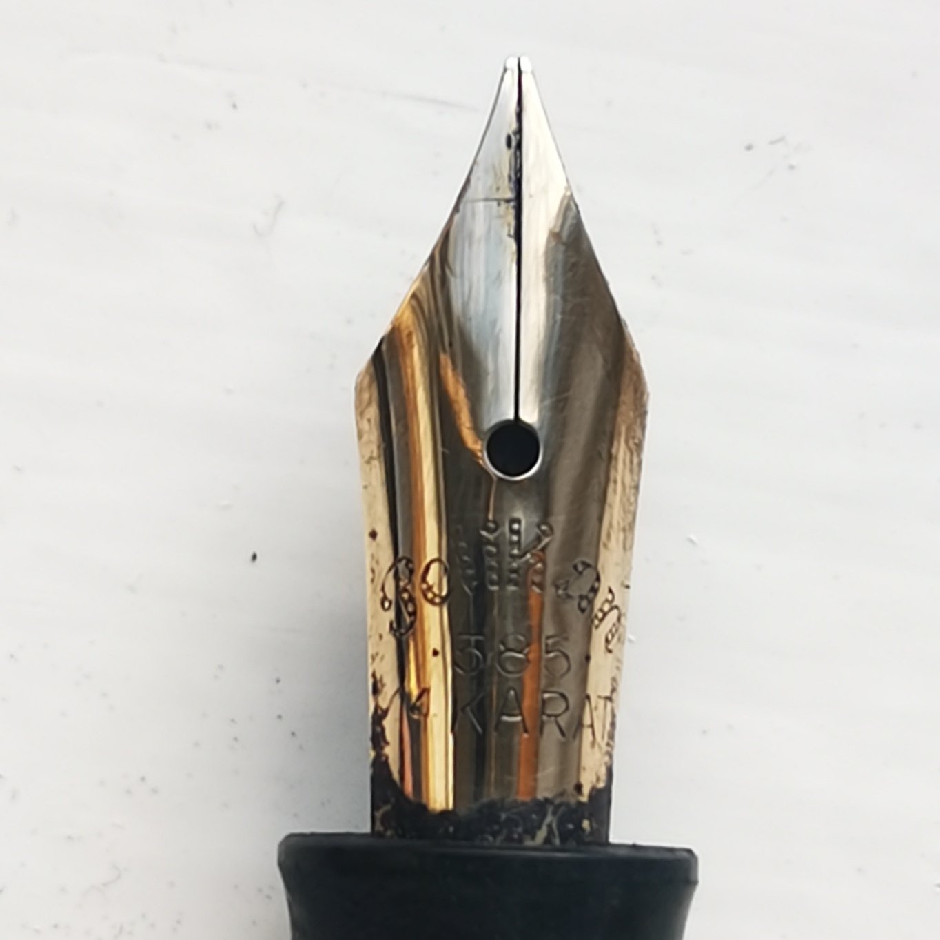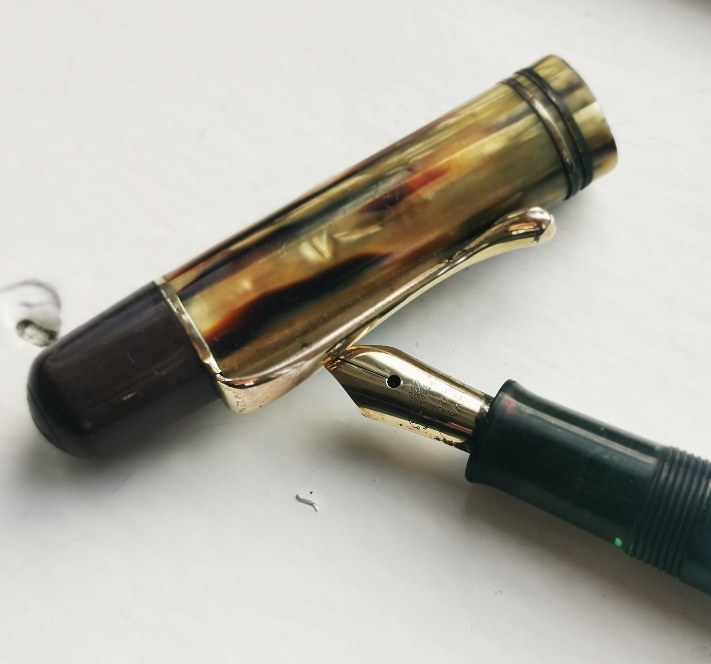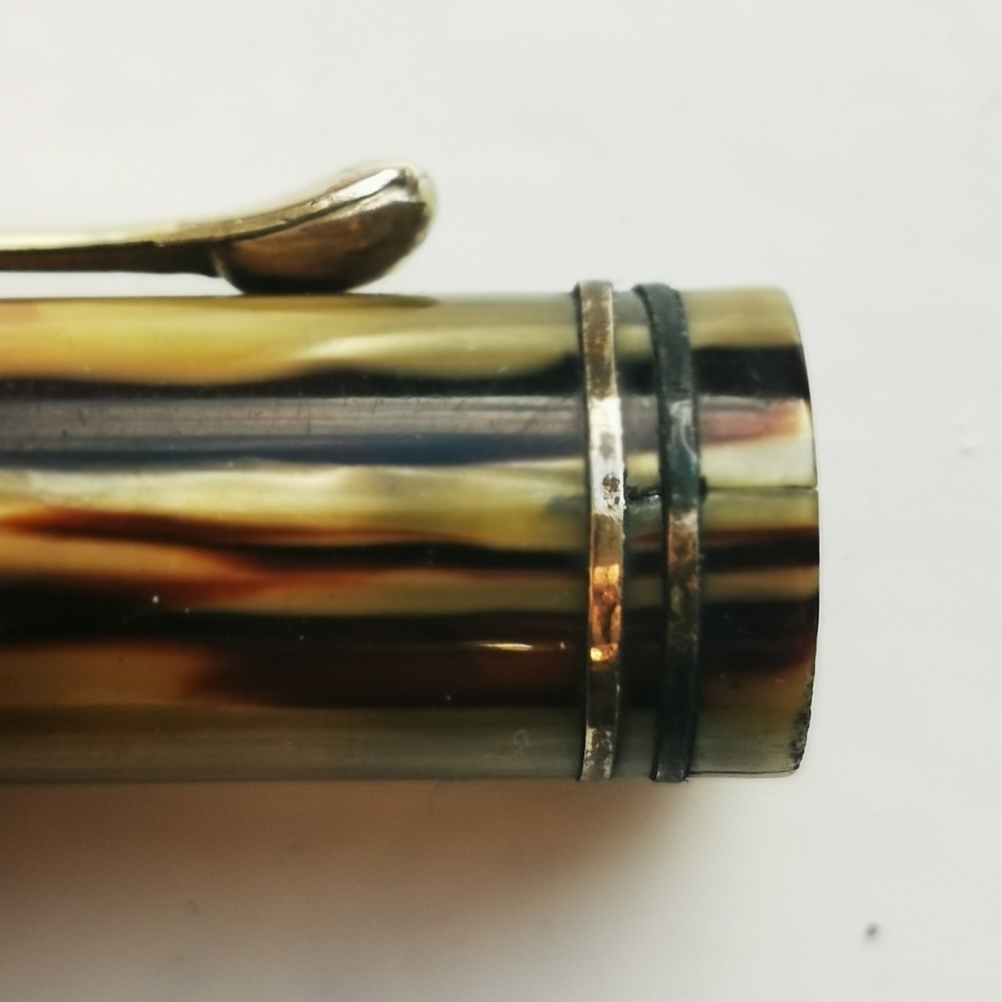 Pelikan 100N skildpadde farvet fyldepen. Piston påfylder. Mekanismen sidder fast. Alle dele originale inclusiv 14 karat Pelikan guldspids. Skal restaureres før end den virker igen. Hætten har to revner (se fotos). Utydelig tekst på den sorte top. Fremstillet i Tyskland i slutnngen af 1930erne. L. 12,5 cm