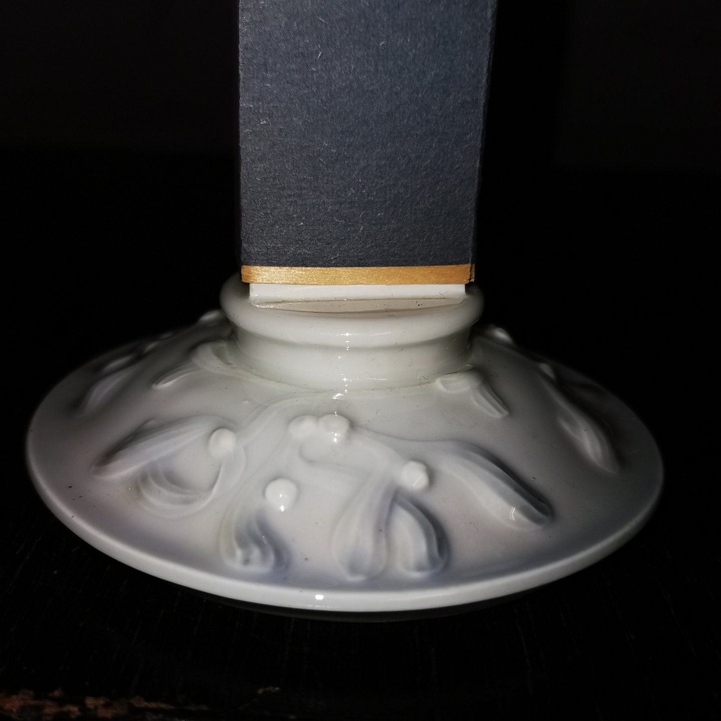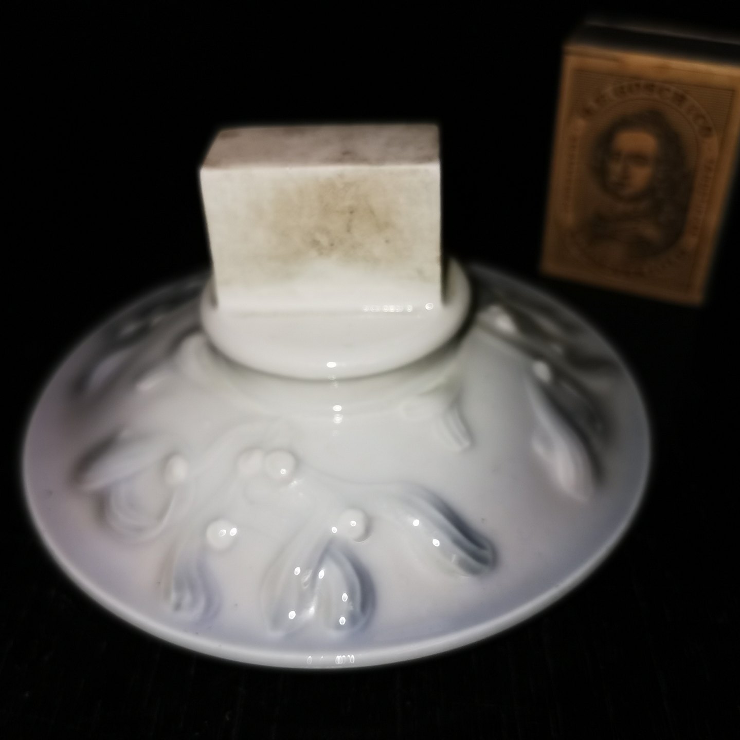 Tændstikæske holder i porcelæn med art nouveau dekoration i relief fra Bing & Grøndahl. Fremstår i god stand. Holderen har et lille afslag (se foto). Fabriksmærket på bunden. Mål: H. 6 cm. Bundens diameter er 11 cm.