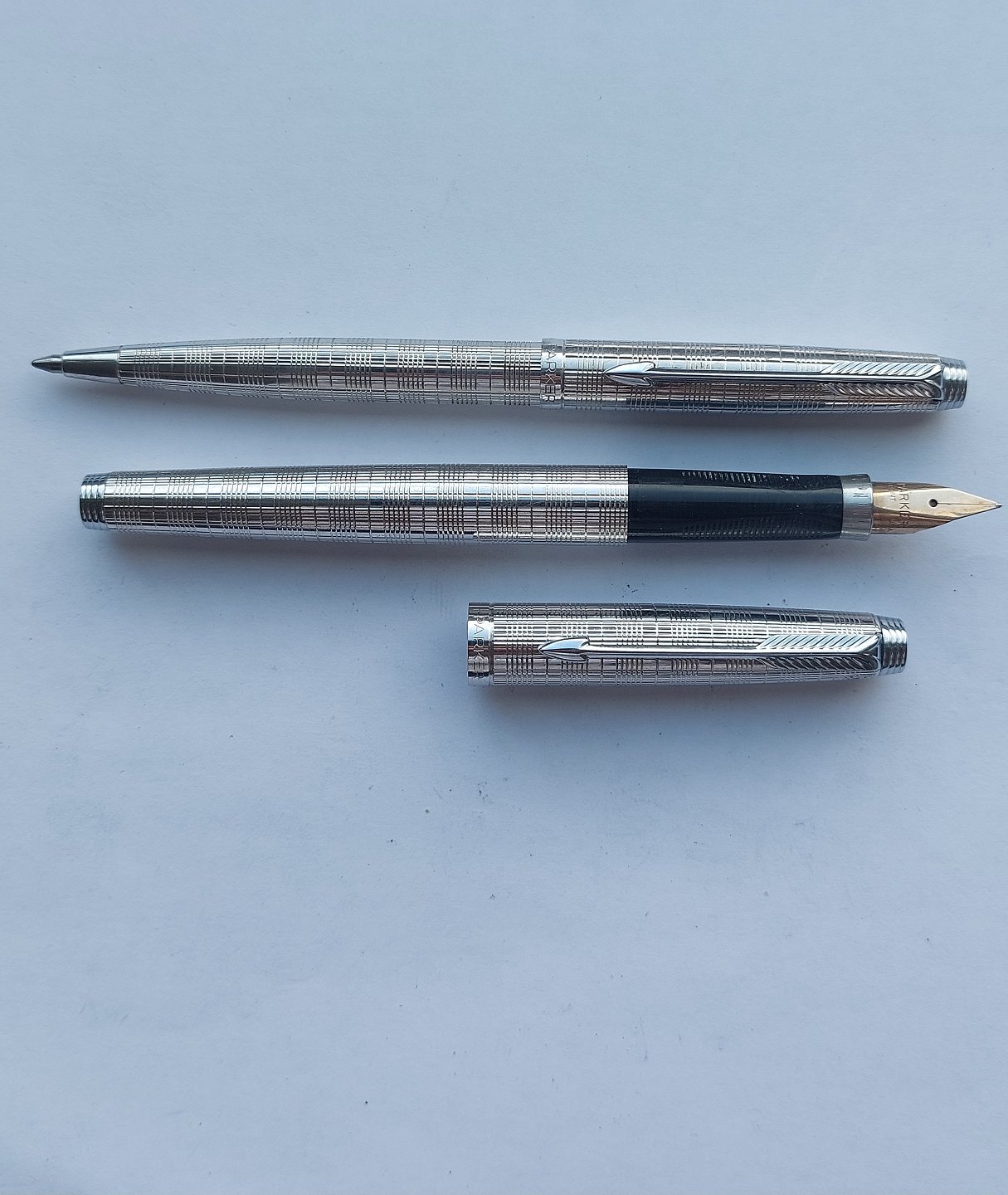 Parker fountain pen set: Fountain pen and ballpoint pen with checkered decoration. Made in silver plated metal in France. The fountain pen nib is in 14 carat gold and made in the USA. The set is ready to be used. No damage or repairs. The fountain pen is 13 cm long.