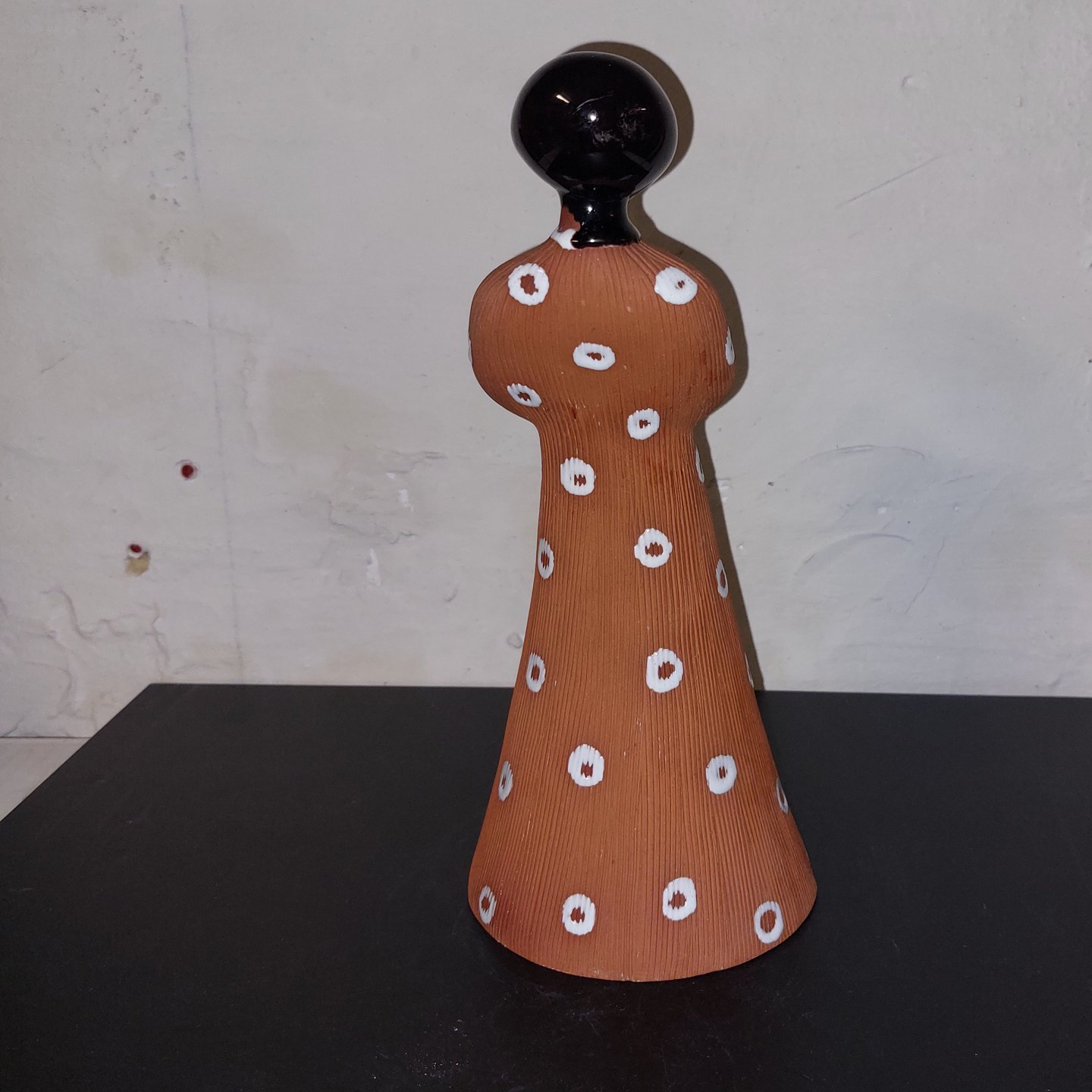 Figur I keramik af kvinde, der fungerer som lysestage. Delvist glaseret i hvid og sort. Fremstillet hos OSA, der var et arbejdsfællesskab, der havde sin begyndelse med tre kunsthåndværkere. Aase Feilberg, Chr. Frederiksen og Gutte Eriksen. Efterfølgende har andre kunstnere arbejdet i dette fællesskab. Figuren er i god stand og uden skader eller reparationer. Fabriksmærket på bundens inderside. H. 27 cm