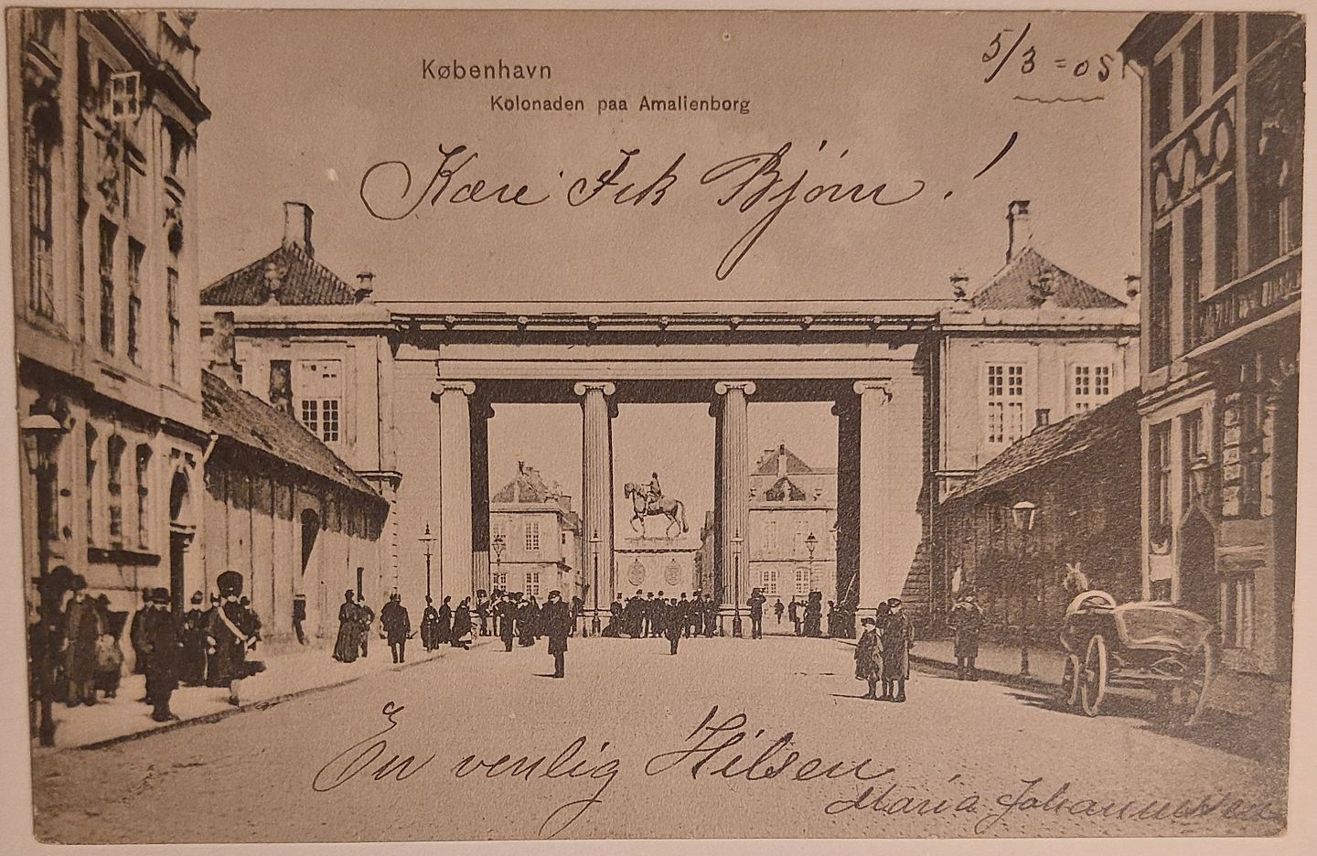 Postkort: Liv ved kolonaden på Amalienborg i 1906