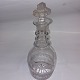 Tøndeformet karaffel med fastblæst riflet underdel i glas med tilhørende prop i presset glas. Fremstillet ca. 1860. Dekoreret med egeløvsfrise. Fremstår I god stand uden skader eller reparationer. Højde, hhv. uden og med prop, 21,5 samt 26 cm