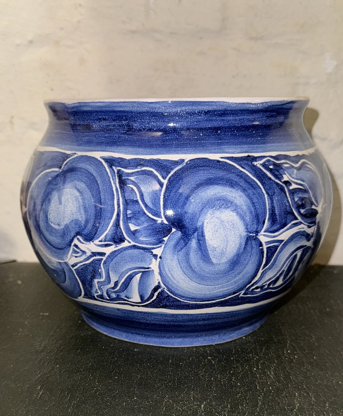 Krukke i keramik med blå dekoration. Fremstillet på Lars Syberg keramik fabrik. I god stand uden skader eller reparationer. Fabriksmærket på bunden. Mål: H. 13,7 cm Ø. 15,5 cm